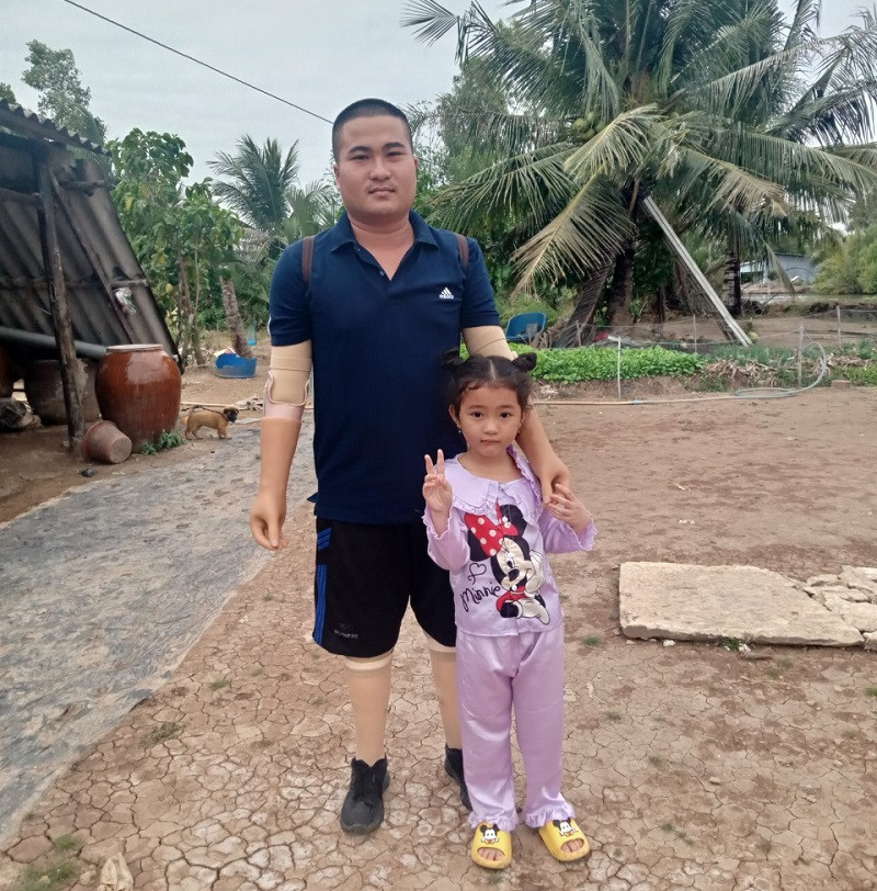 Những ngày sắp bước sang năm mới, ngôi nhà của gia đình bà Lâm Kim Quen (53 tuổi, Cà Mau) tuy vẫn đơn sơ nhưng đã ấm cúng, vui vẻ hơn. Nhất là con gái gần 4 tuổi tuổi của anh Huỳnh Hữu Tình (27 tuổi). Cô bé đã thân thuộc với đôi tay, đôi chân mới của cha, thường vây quanh anh Tình chơi đùa.