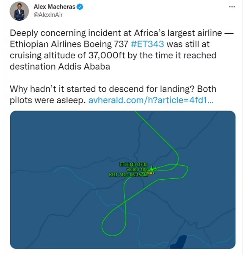 Nhà phân tích hàng không Alex Macheras viết trên Twitter: 'Sự cố đáng lo ngại của hãng hàng không lớn nhất châu Phi - Ethiopian Airlines Boeing 737 # ET343 vẫn đang bay ở độ cao 37.000ft vào thời điểm lẽ ra phải đến Addis Ababa.