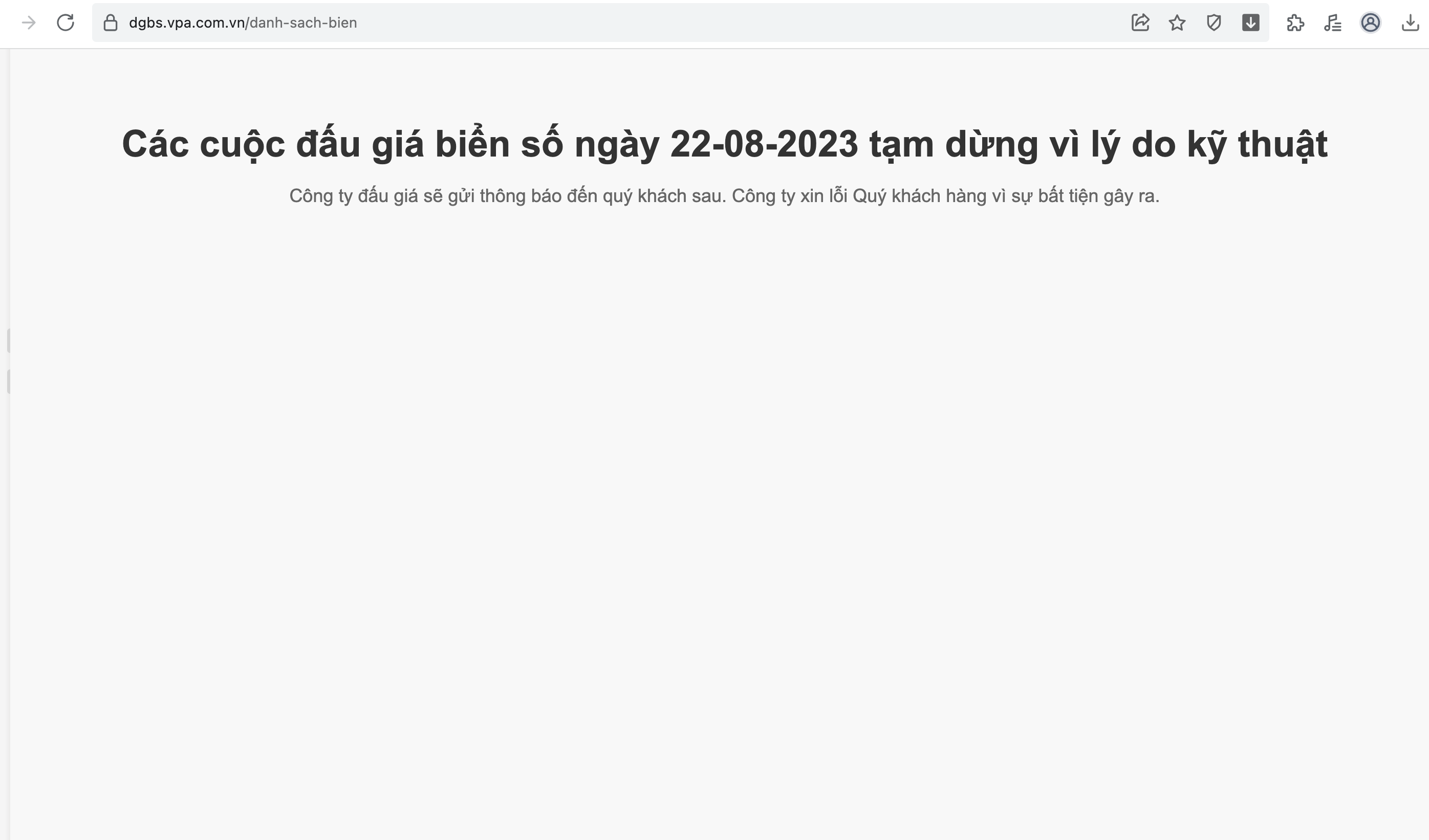 Lúc 10h22, trang đấu giá biển số ô tô ra thông báo "Các cuộc đấu giá biển số ngày 22/8 tạm dừng vì lý do kỹ thuật".