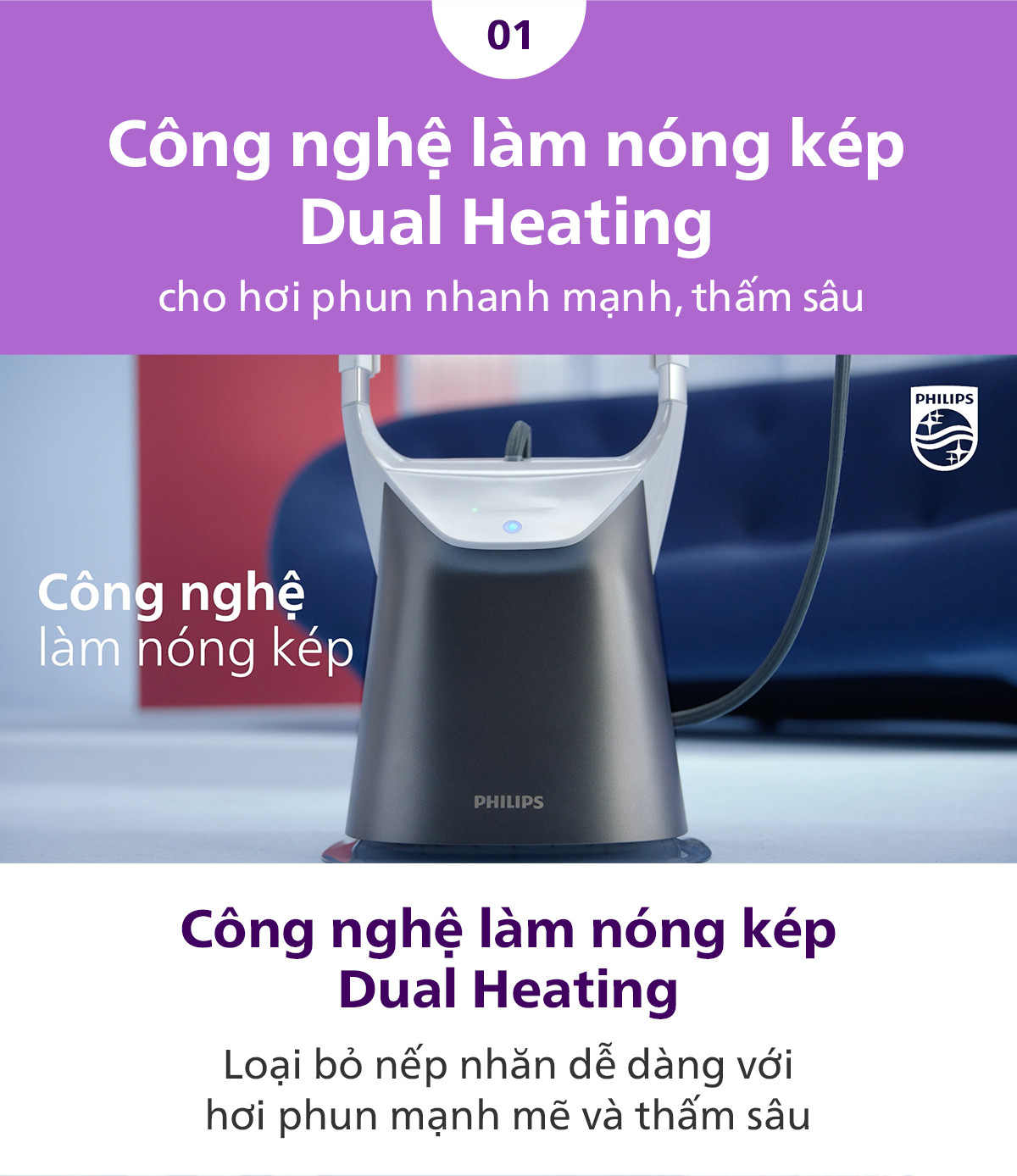 Thời gian luôn là điều xa xỉ với tất cả mọi người. Để tiết kiệm thời gian tối đa, bàn ủi hơi nước đứng All-in-one Philips GC628/80 là một lựa chọn thông minh cho các tín đồ thời trang yêu sự hoàn hảo. Công nghệ làm nóng kép Dual Heating tạo ra hơi phun mạnh mẽ lập tức ủi phẳng mọi nếp nhăn trên quần áo.