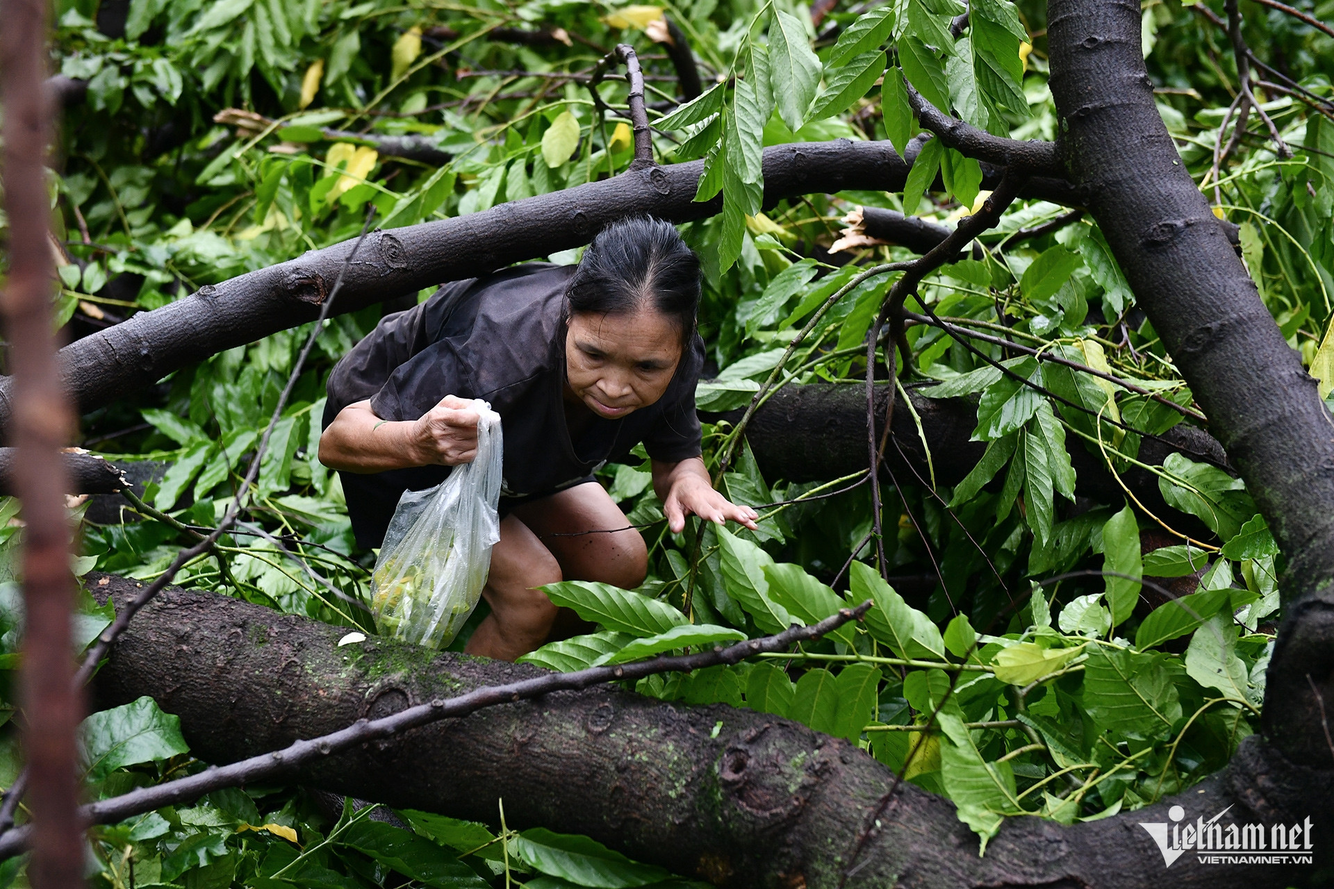 Trên phố Tôn Đức Thắng đoạn gần Nguyễn Thái Học, dù phía trước một cây đổ chắn hết lối đi, một phụ nữ vẫn cố đi lên trên tán lá cây và bị ngã xe.