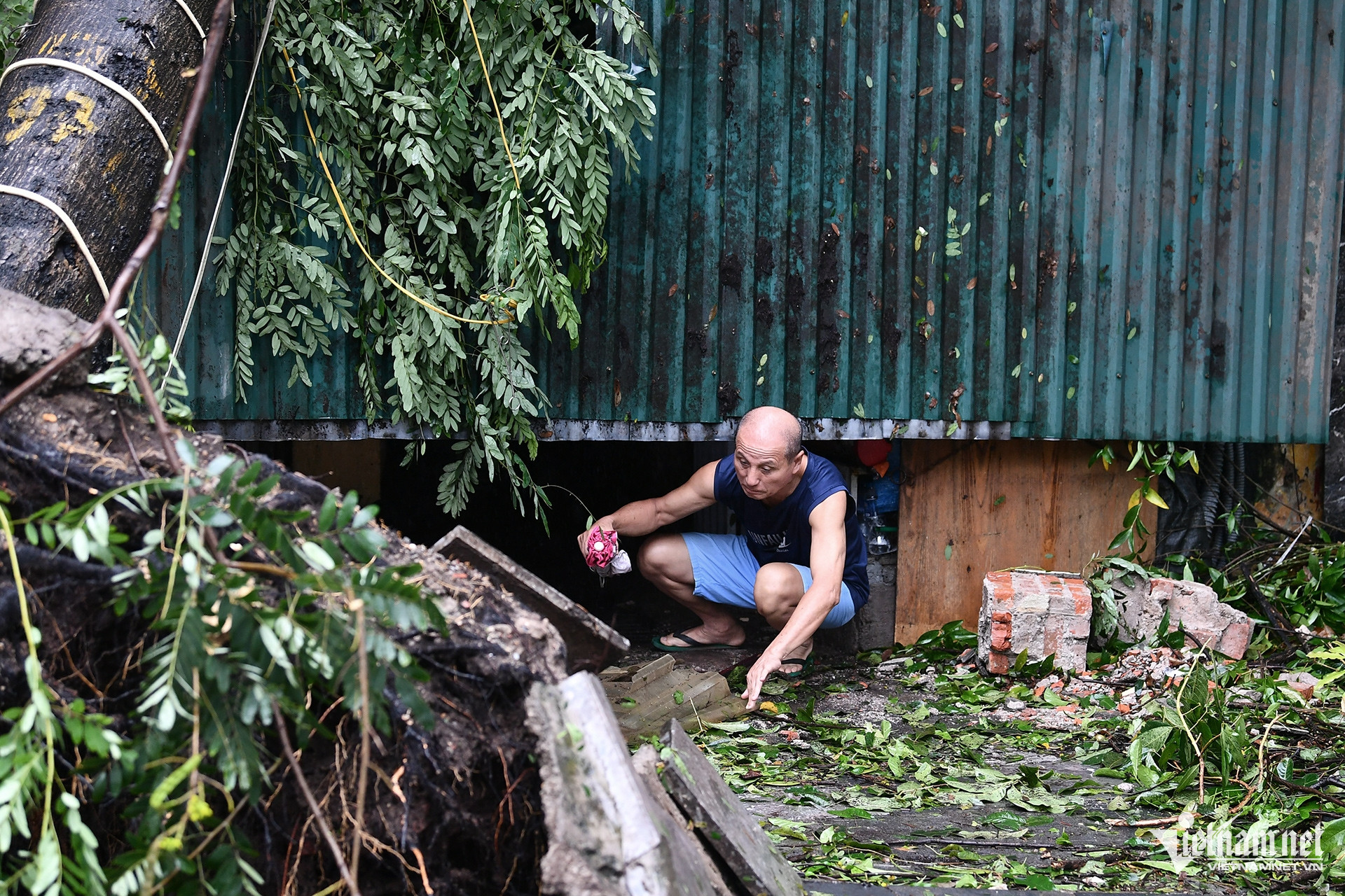 Hàng Phở Thìn Bờ Hồ nổi tiếng bị cây đổ vào hỏng cả bức tường mặt tiền và mái nhà.