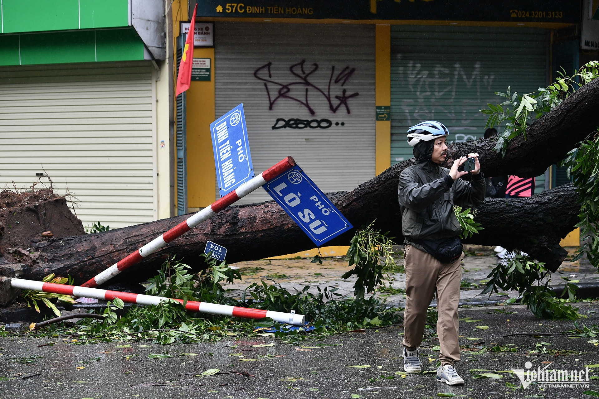 Nhiều cột biển tên phố bị cây đổ đè gãy, trong đó có biển tên các phố Đinh Tiên Hoàng, Lò Sũ...
