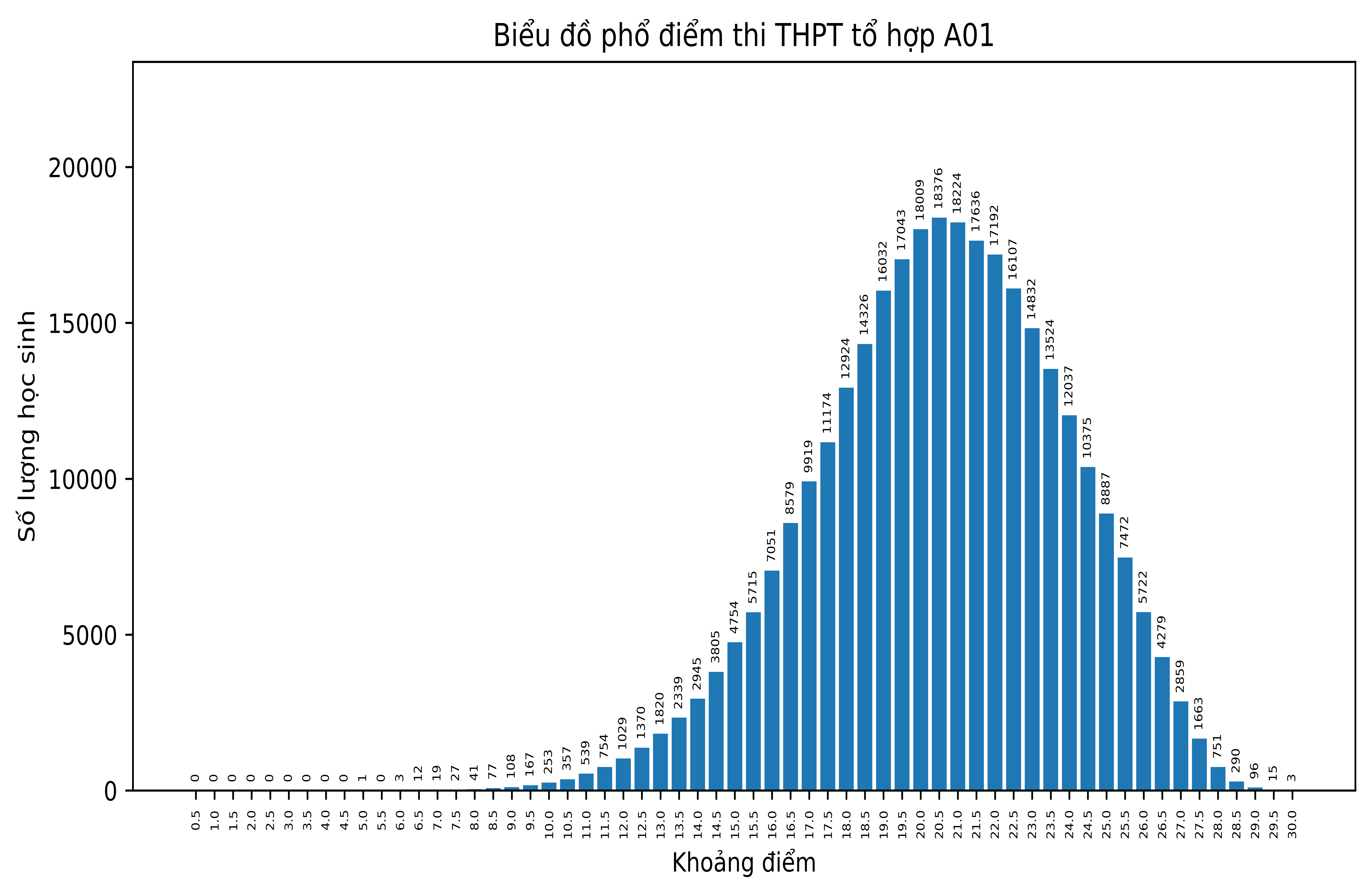 Đối với 2 tổ hợp A01 và B00, mức điểm khá giống nhau khi đỉnh của 2 khối đều rơi vào ngưỡng 20-20,5 điểm. Tuy nhiên, số lượng thí sinh B00 đạt tổng ba môn từ 25 điểm ít hơn A01. Ngược lại, có 3 thí sinh đạt mức 29,5-30 điểm ở tổ hợp A01, trong khi không ai đạt ngưỡng này tại tổ hợp B00.