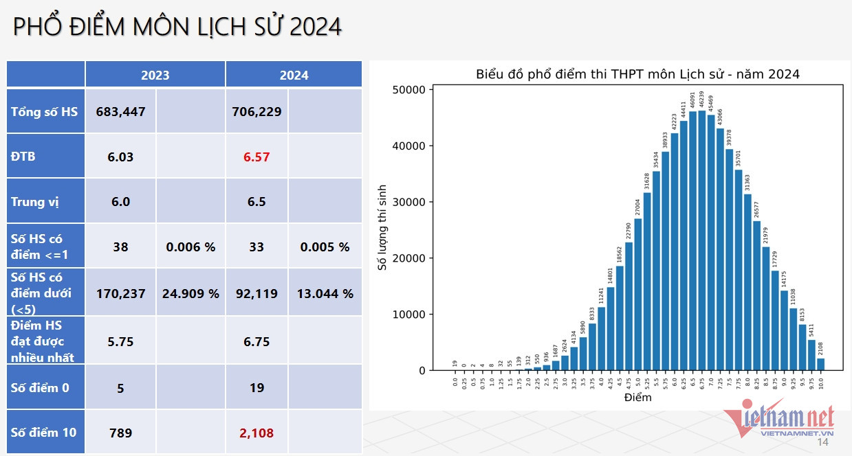Kết quả phân tích phổ điểm thi tốt nghiệp THPT môn Lịch sử của cả nước năm 2024 cho thấy mức điểm trung bình là 6,57. Có 33 thí sinh có bài thi dính điểm liệt. Mức điểm mà các học sinh đạt được nhiều nhất là 6,75. Có 2.108 bài thi đạt điểm 10, nhưng có 19 bài thi 0 điểm.