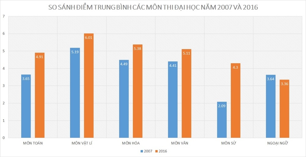 Điểm trung bình của môn Lịch sử tăng từ 2,09 (2007) lên 4,3 (2016) trong khi môn Ngoại ngữ lại giảm từ 3,54 xuống 3,36.