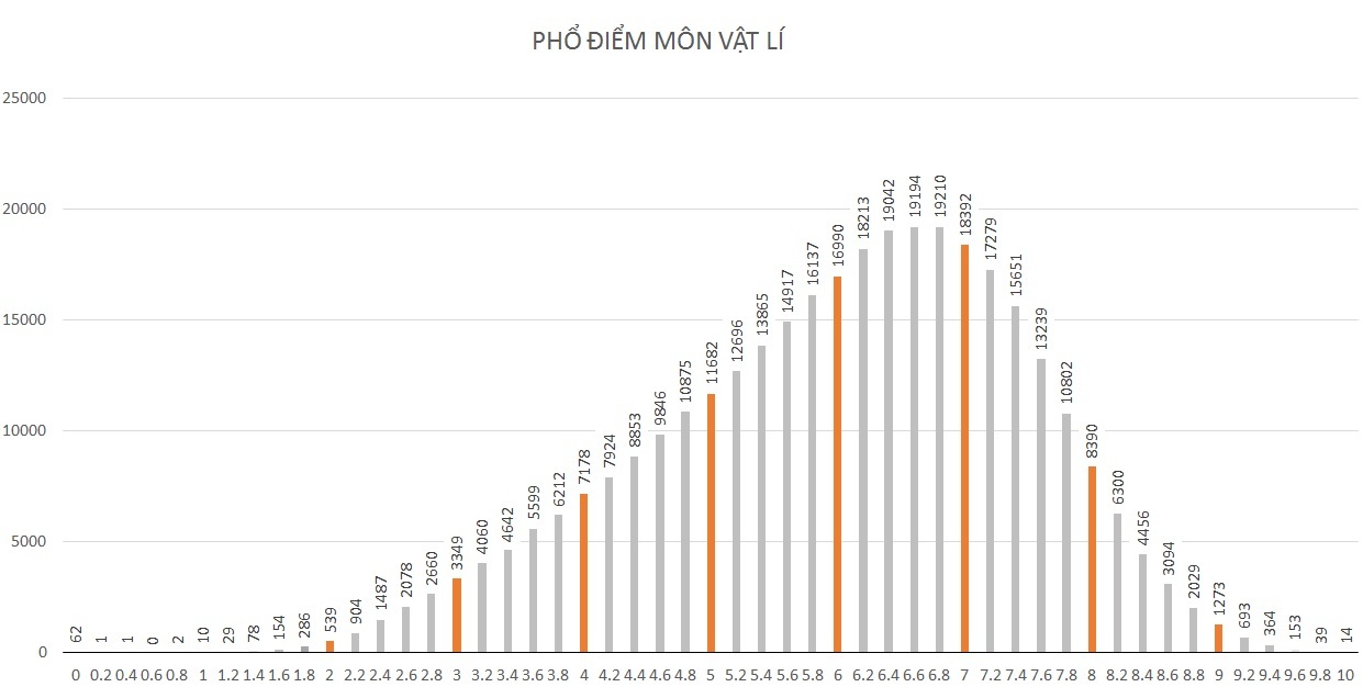 Cả nước có 14 thí sinh đạt điểm 10 môn Vật lí. Điểm trung bình của môn này là 5.96, cao nhất trong tất cả các môn thi năm nay.