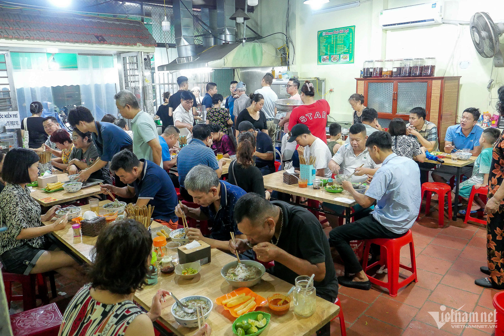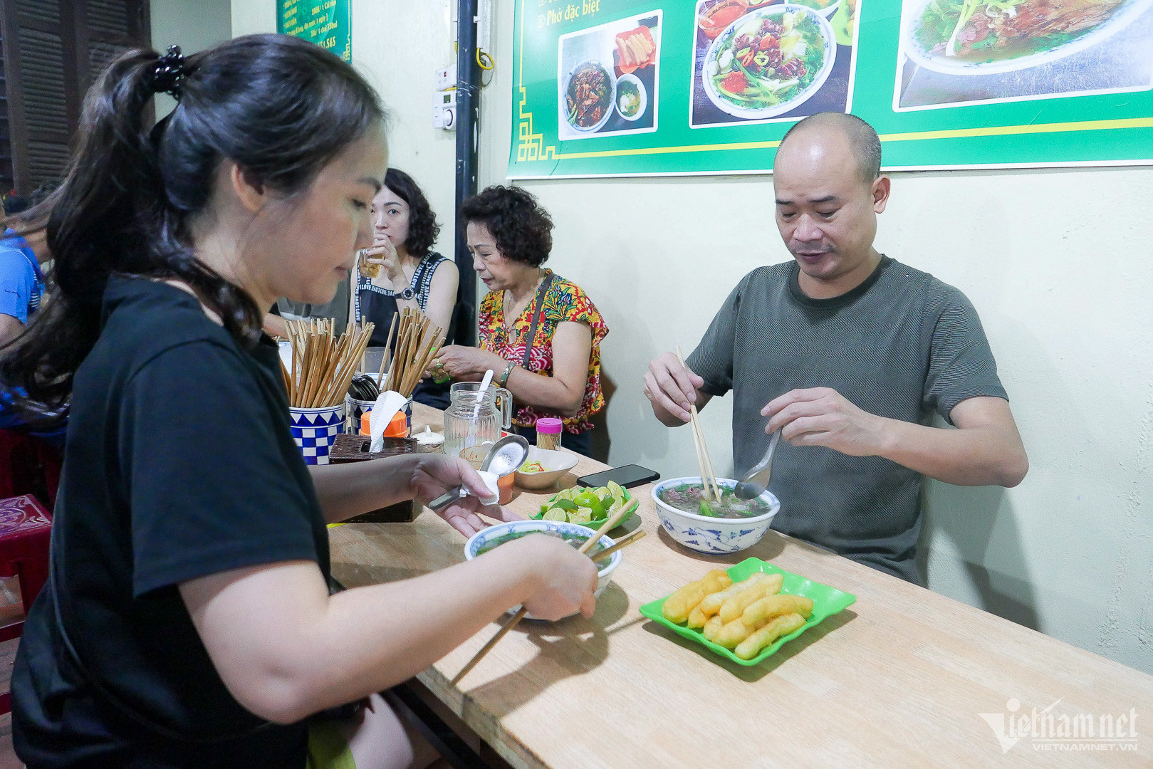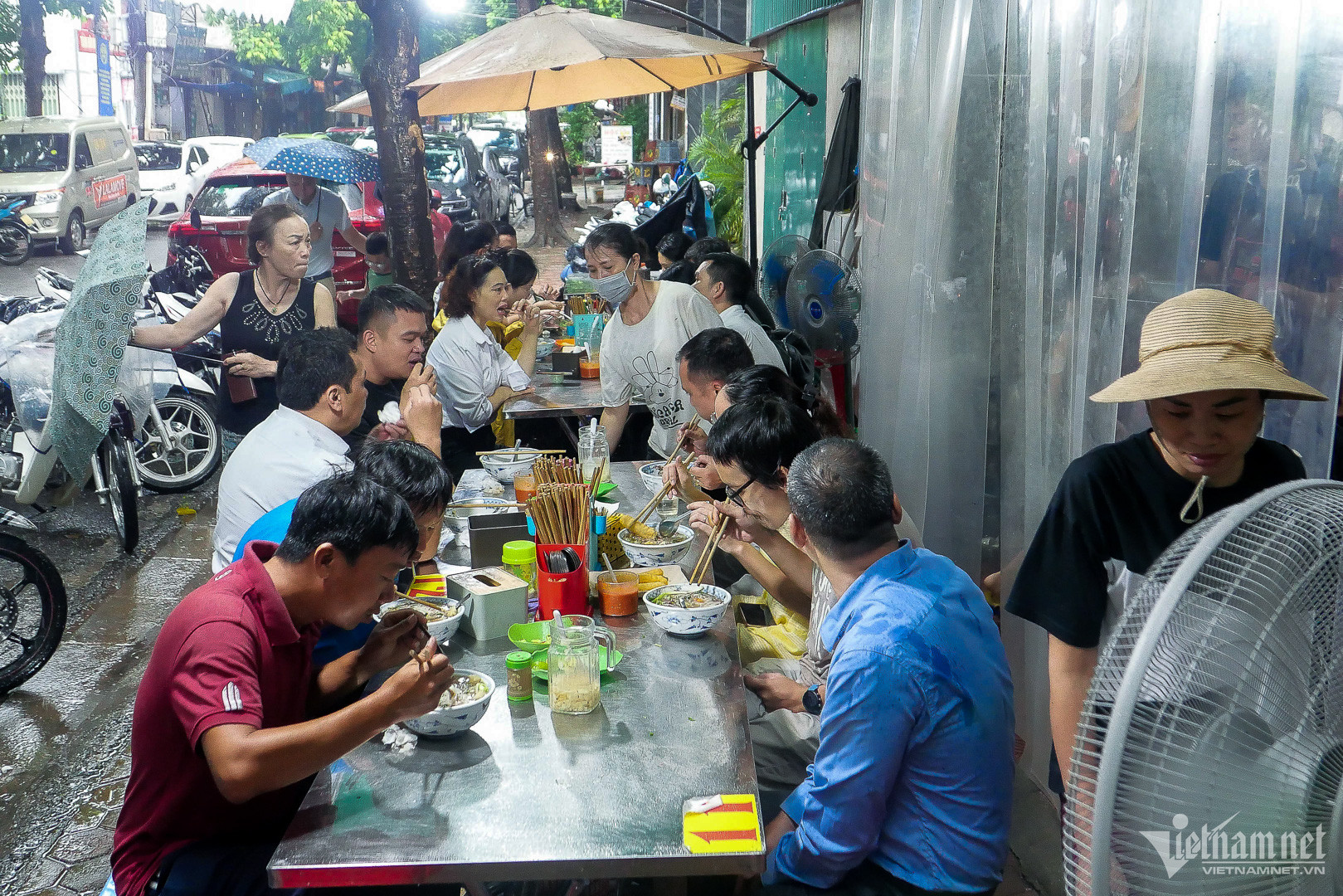 "Cuối tuần nào quán này cũng đông kín khách, nhất là từ 7h30 - 10h30. Ngày không mưa, có khi 20 người đứng xếp hàng. Nhiều khi, tôi ngồi ăn cũng nóng ruột vì xung quanh nhiều khách khác thấp thỏm chờ chỗ”, anh Minh (Tây Hồ, áo xám) khách quen của quán cho biết.