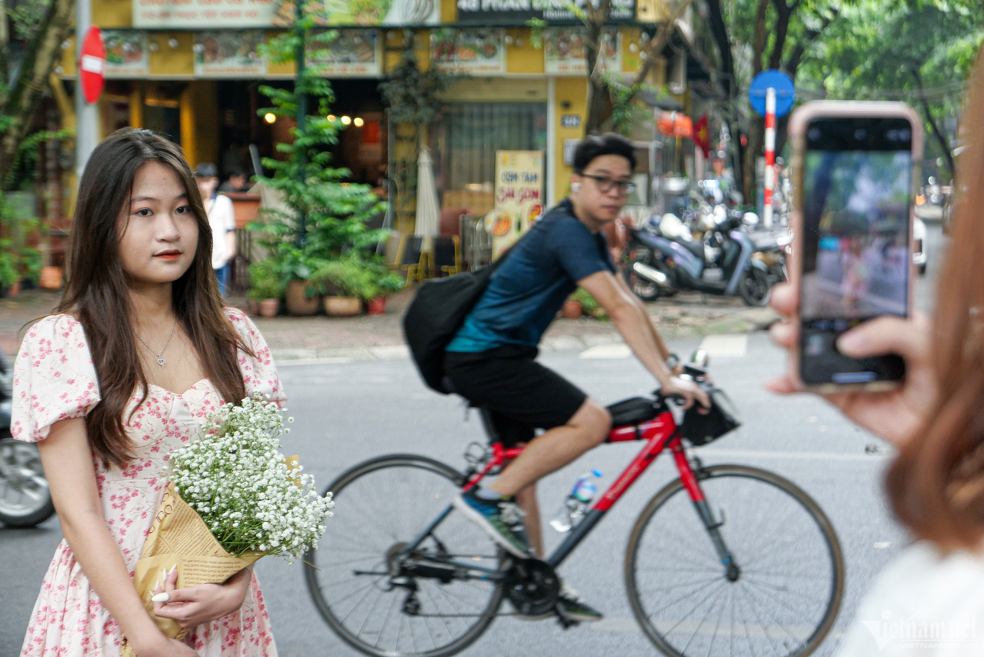 Trên vỉa hè cũng xuất hiện dày đặc các gánh hàng hoa, hàng rong bán sấu tươi, xôi cốm, nước uống... cùng các dịch vụ tự phát như trông xe, cho thuê xe đạp chụp ảnh...