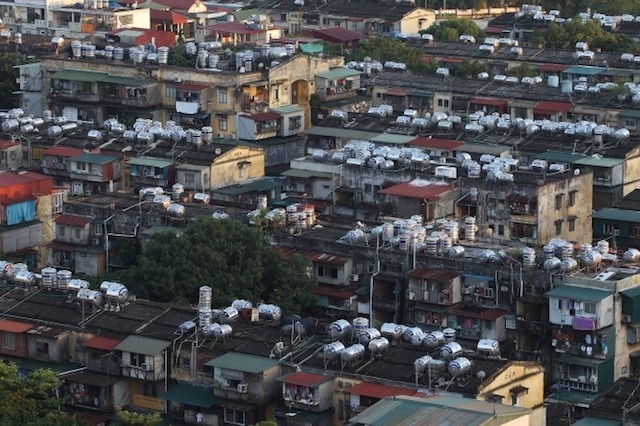 4 dãy nhà tập thể nằm ở mặt phố Lê Hồng Phong (Hà Nội) được xây dựng từ những năm 1970, đến nay đã xuống cấp xập xệ. Nhiều người dân nơi đây luôn sống trong lo sợ với những mảng tường lở, mái ngói xô lệch, thủng vỡ…