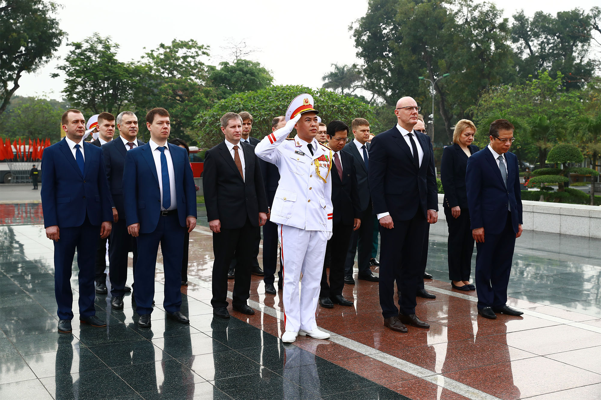 Sáng nay, Phó Thủ tướng Nga bắt đầu các hoạt động trong chuyến thăm chính thức. Ông Dmitry Chernyshenko đã đến đặt vòng hoa và vào lăng viếng Chủ tịch Hồ Chí Minh, đặt vòng hoa tại Đài tưởng niệm các anh hùng liệt sĩ trên đường Bắc Sơn.