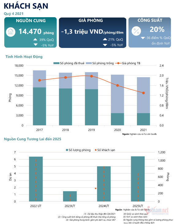 Giá phòng trung bình chứng kiến mức tăng 21% theo quý, lên gần 1,4 triệu đồng/phòng/đêm khi hoạt động du lịch bắt đầu nóng trở lại. Tuy nhiên, giá phòng đã giảm 5% theo năm do các khách sạn 5 sao giảm giá để phục vụ khách trong nước và khách sạn 3 sao cắt giảm dịch vụ ăn uống do thiếu lao động.