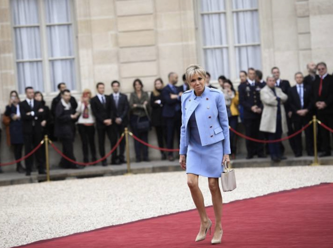 Khi tham dự những cuộc gặp chính thức với vai trò đệ nhất phu nhân, vợ Tổng thống Pháp thường chọn váy chữ A và áo khoác phù hợp với váy. Bà Brigitte Macron cũng không ngại lựa chọn những phong cách táo bạo, bà thường mặc áo khoác kiểu nhà binh hoặc áo khoác có hàng cúc bằng kim loại.