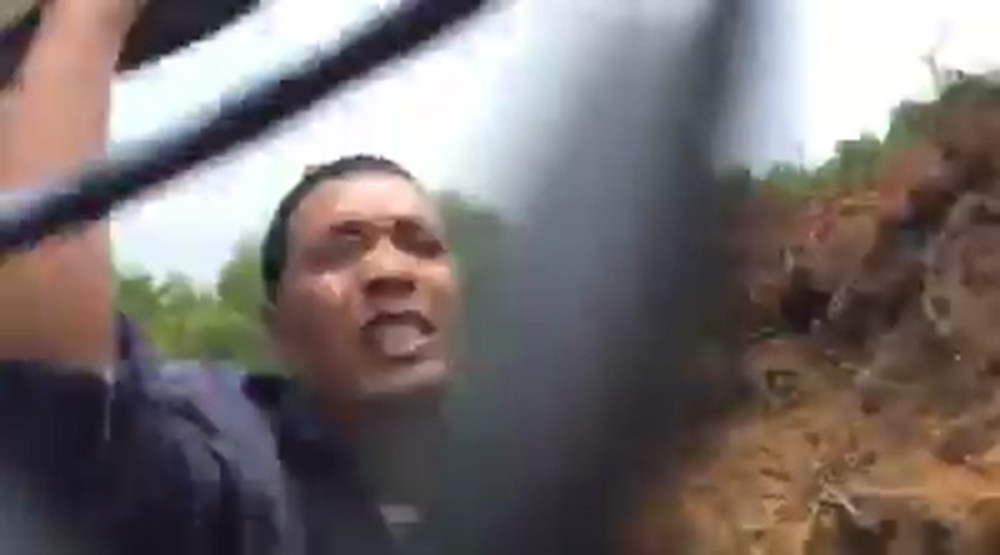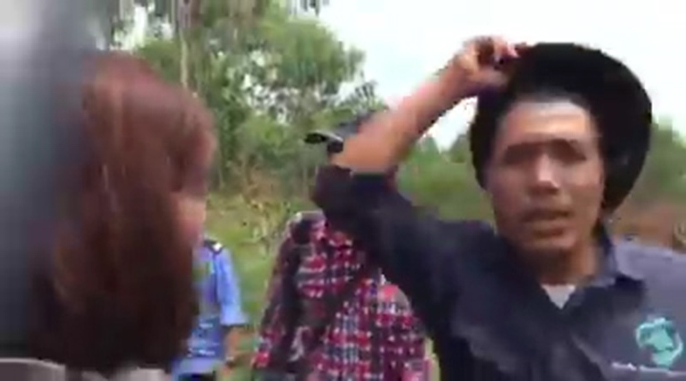 Nhóm người tư xưng là bảo vệ của Cty Phú Hà cầm mũ cối đánh phóng viên. Ảnh cắt từ clip |