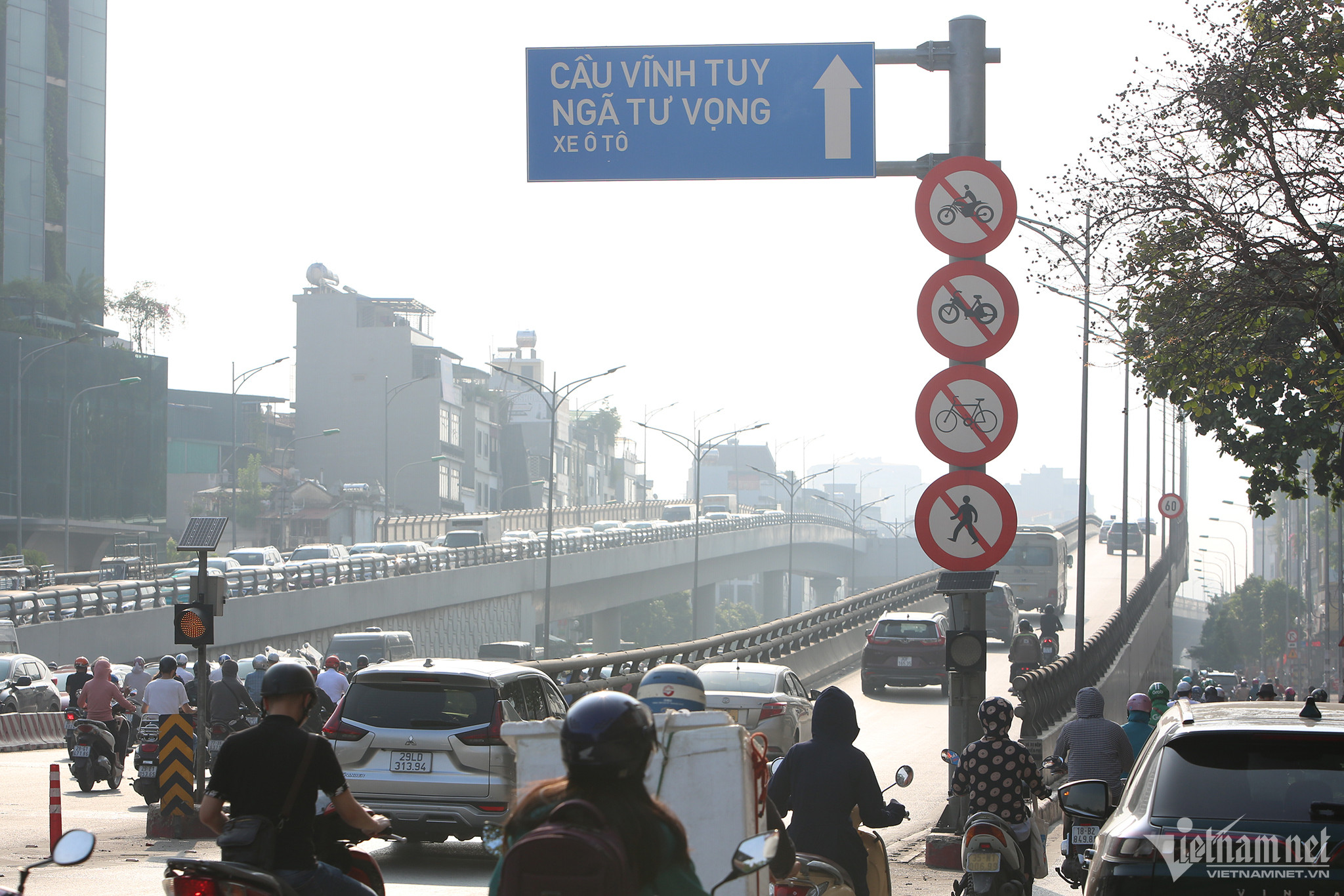 Các xe này đi lên đường Vành đai 2 trên cao từ đường dẫn lên khu vực cầu Vĩnh Tuy, lưu thông gần 5km đến điểm xuống nút Ngã Tư Sở.