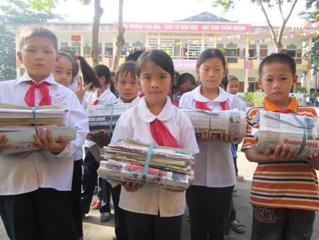 Trước đây con học trường công, đóng đủ loại giấy báo tạp chí. Từ hai năm nay con chuyển sang trường dân lập, trường yêu cầu là sách vở cũ. Chúng nó cũng có nghe thủng đâu, hình như cô bảo là ủng hộ bạn nghèo, nên yêu cầu như vậy”.