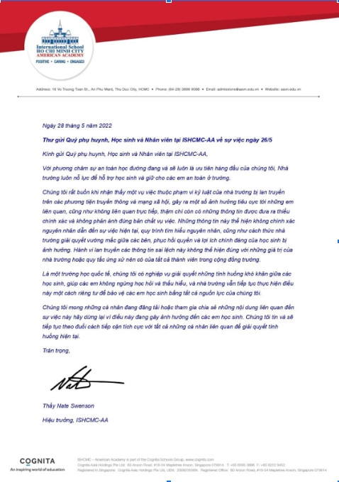 Trong khi đó, hơn 2 ngày kể từ khi xảy ra vụ việc, đêm 28/5, trên fanpage của Trường quốc tế ISHCMC-AA đăng tải một bức thư gửi phụ huynh, học sinh và nhân viên, kí tên 'Thầy Nate Swenson".