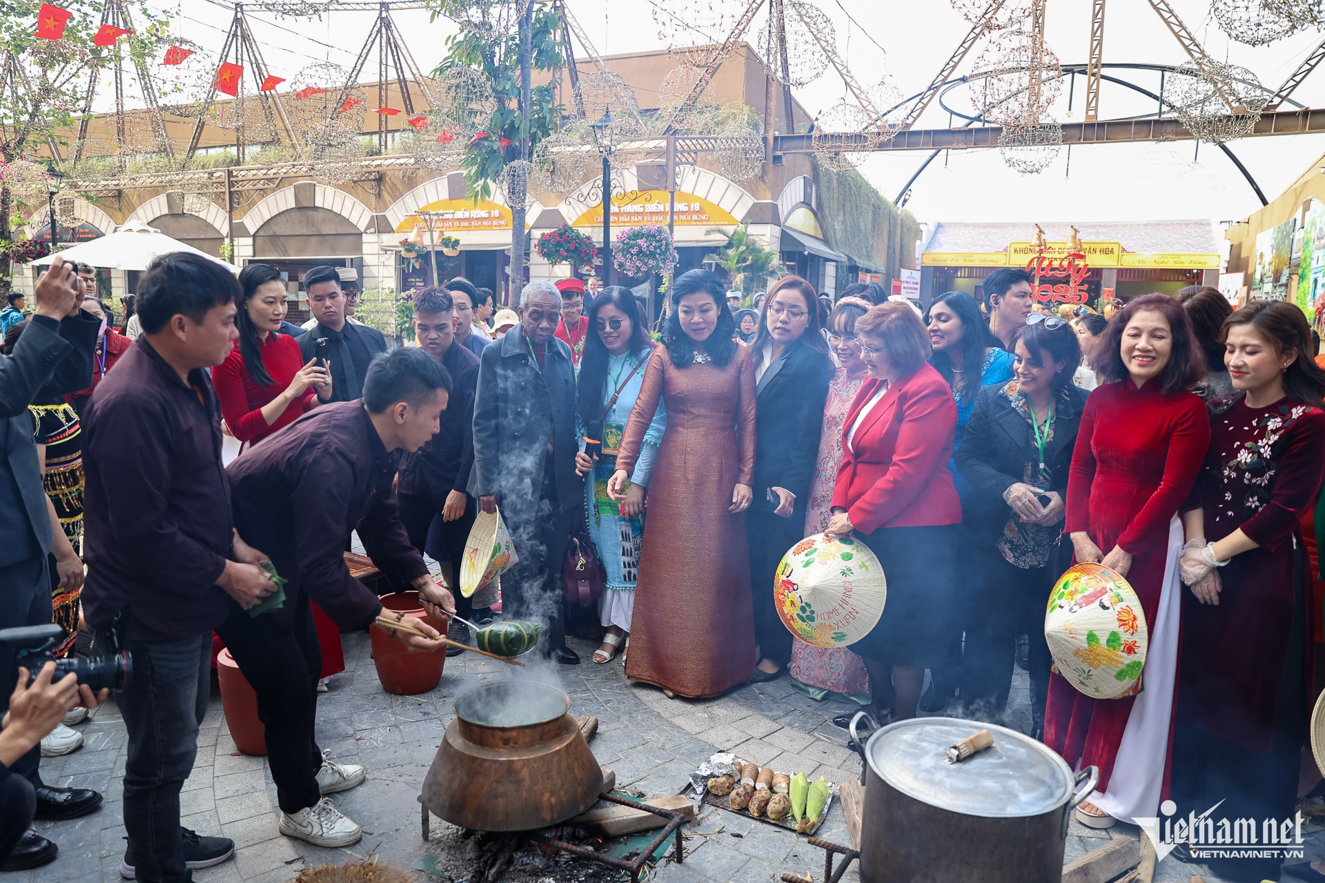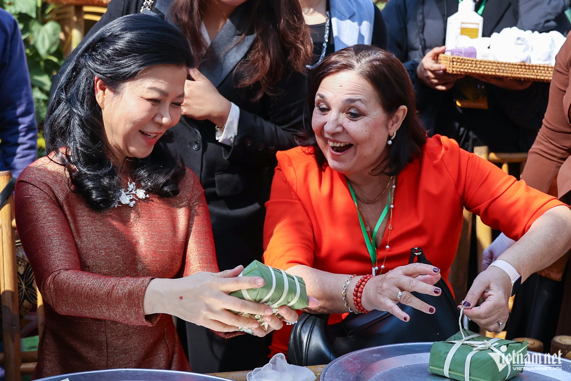 Đặc biệt, Phu nhân Ngô Phương Ly và các đại sứ đã trải nghiệm gói và luộc bánh chưng - bánh cổ truyền ngày Tết của người Việt Nam.