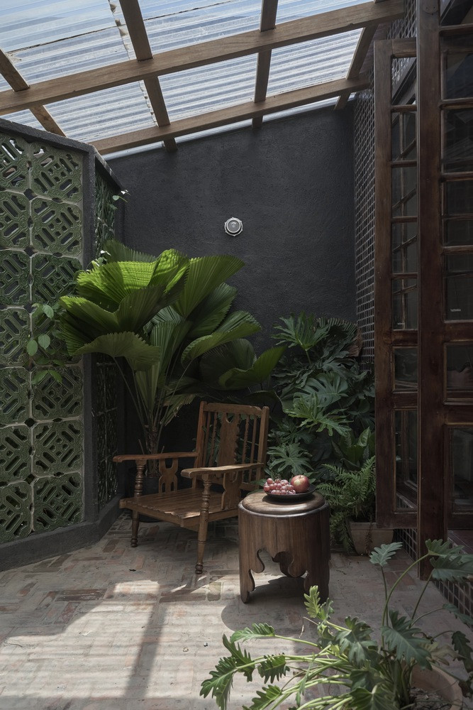 Không gian phòng khách phảng phất phong cách nếp nhà xưa với tông màu hoài cổ kết hợp khéo léo cùng gạch men hiện đại.Hàng rào sử dụng gạch gốm tráng men màu xanh, sân trước nhà lát bằng gạch đất nung thô càng làm bật lên vẻ mộc mạc, sự yên bình, thư thái mỗi ngày.Phòng khách mở hướng ra sân vườn, được tô điểm sắc xanh của cây lá khắp nơi.Màu sắc chủ đạo của Ngâu House là màu nâu, cam đất, đỏ của ngói đất nung và tông ấm của gỗ. Sự kết hợp giữa hiện đại và cổ xưa, độc đáo và hài hòa tạo nên một không gian sống đầy mê hoặc…