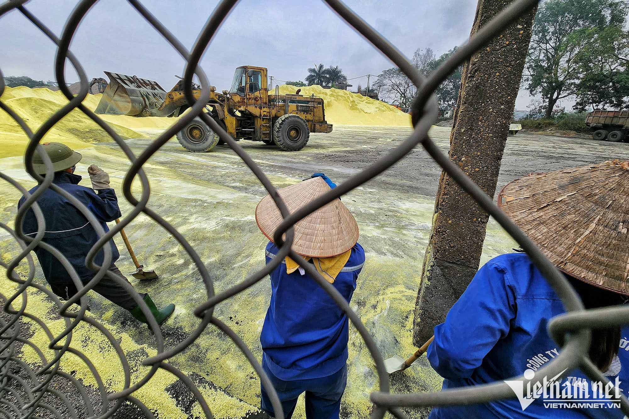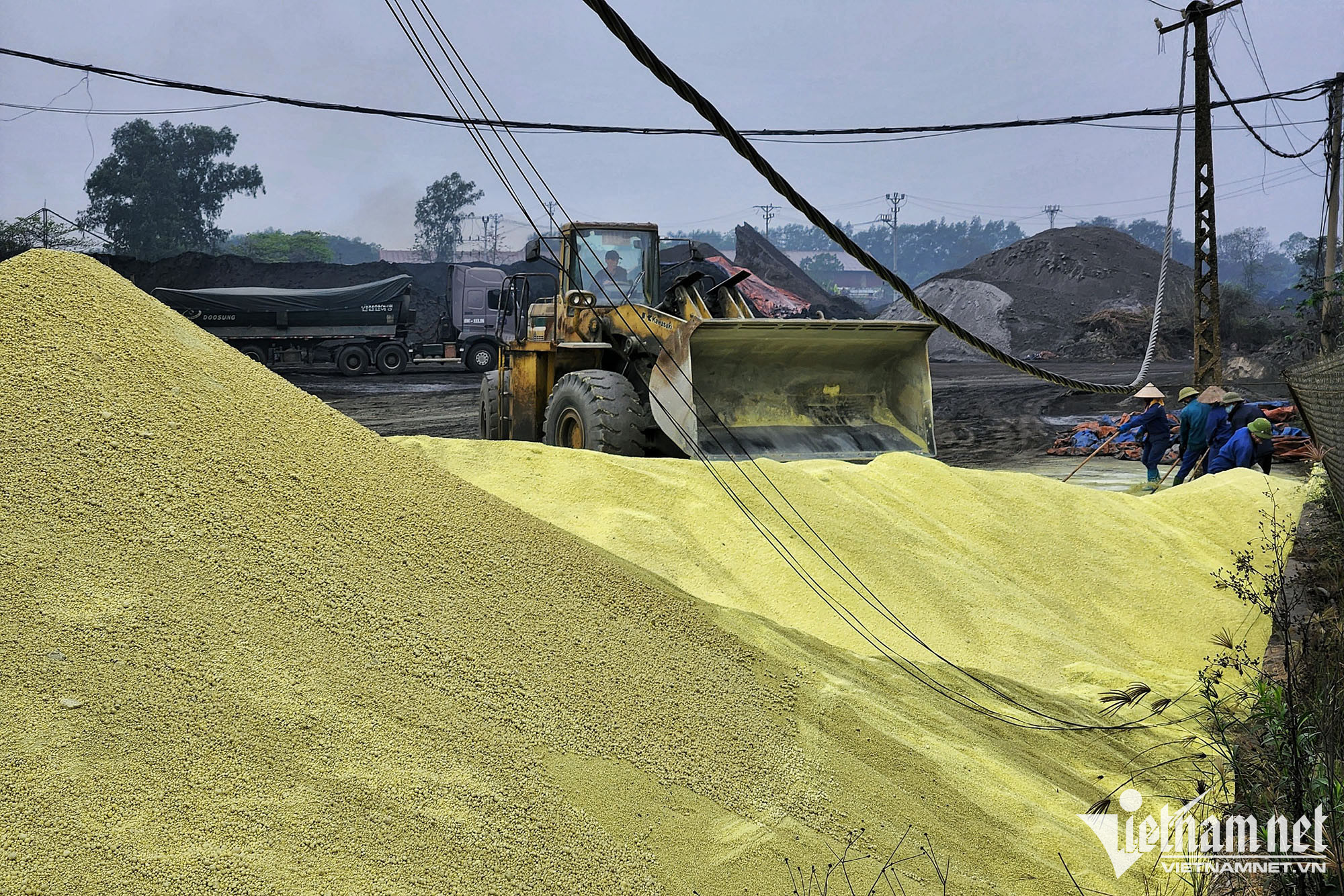 Nhóm khoảng 5 công nhân có nhiệm vụ dùng xẻng để xúc lưu huỳnh từ trong các vách tường ra để máy xúc vun thành đống trước khi chất lên xe tải. Nhiều chuyến xe đầy ắp lưu huỳnh đã rời khỏi bãi tập kết ven sông Lô.