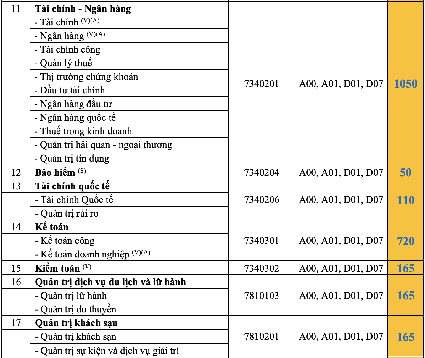 Các tổ hợp gồm: Tổ hợp A00: Toán, Vật lý, Hóa học; Tổ hợp A01: Toán, Vật lý, Tiếng Anh; Tổ hợp D01: Toán, Ngữ Văn, Tiếng Anh; Tổ hợp D07: Toán, Hóa học, Tiếng Anh; Tổ hợp D96: Toán, Khoa học xã hội, Tiếng Anh; Tổ hợp V00: Toán, Vật lý, Vẽ mỹ thuật.