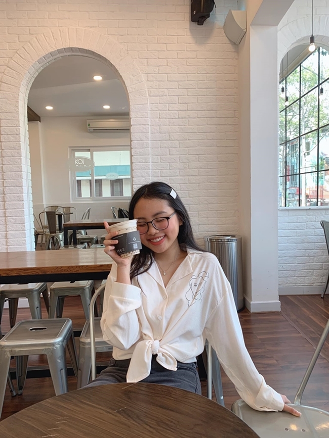 Phương Mỹ Chi trẻ trung và nữ tính khi chọn mặc áo sơ mi cách điệu. |