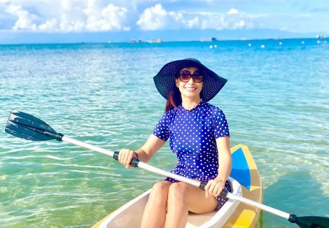 Là bà mẹ 2 con, cựu siêu mẫu Thúy Hạnh vẫn tự tin khoe body qua những trang phục áo tắm. Trong chuyến du lịch Phú Quốc gần đây, cô đăng tải những khoảnh khắc đẹp bên bãi cát trắng. "Chia sẻ ảnh mình giảm cân thành công, sắp chạm lại số cân thời mới vào nghề...", cô tự hào khoe.
