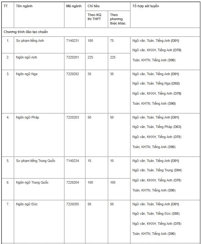 Theo đó, đối với chương trình đào tạo chuẩn, năm 2023, Trường ĐH Ngoại ngữ - ĐH Quốc gia Hà Nội có 4 phương thức xét tuyển gồm: