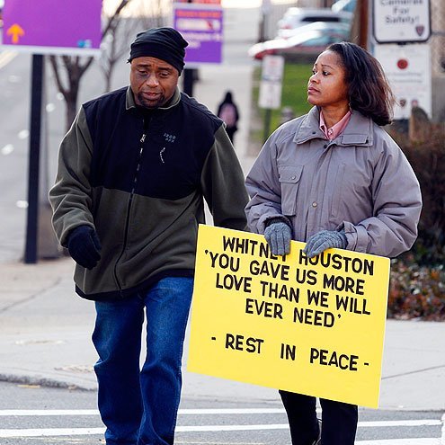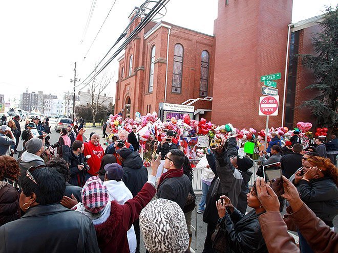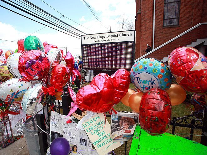 Người hâm mộ đặt hoa, bóng bay và viết những dòng tưởng nhớ nữ ca sĩ xấu số bên ngoài nhà thờ New Hope Baptist ở Newark, N.J., nơi Whitney từng hát khi còn nhỏ và cũng là nơi diễn ra tang lễ của cô.