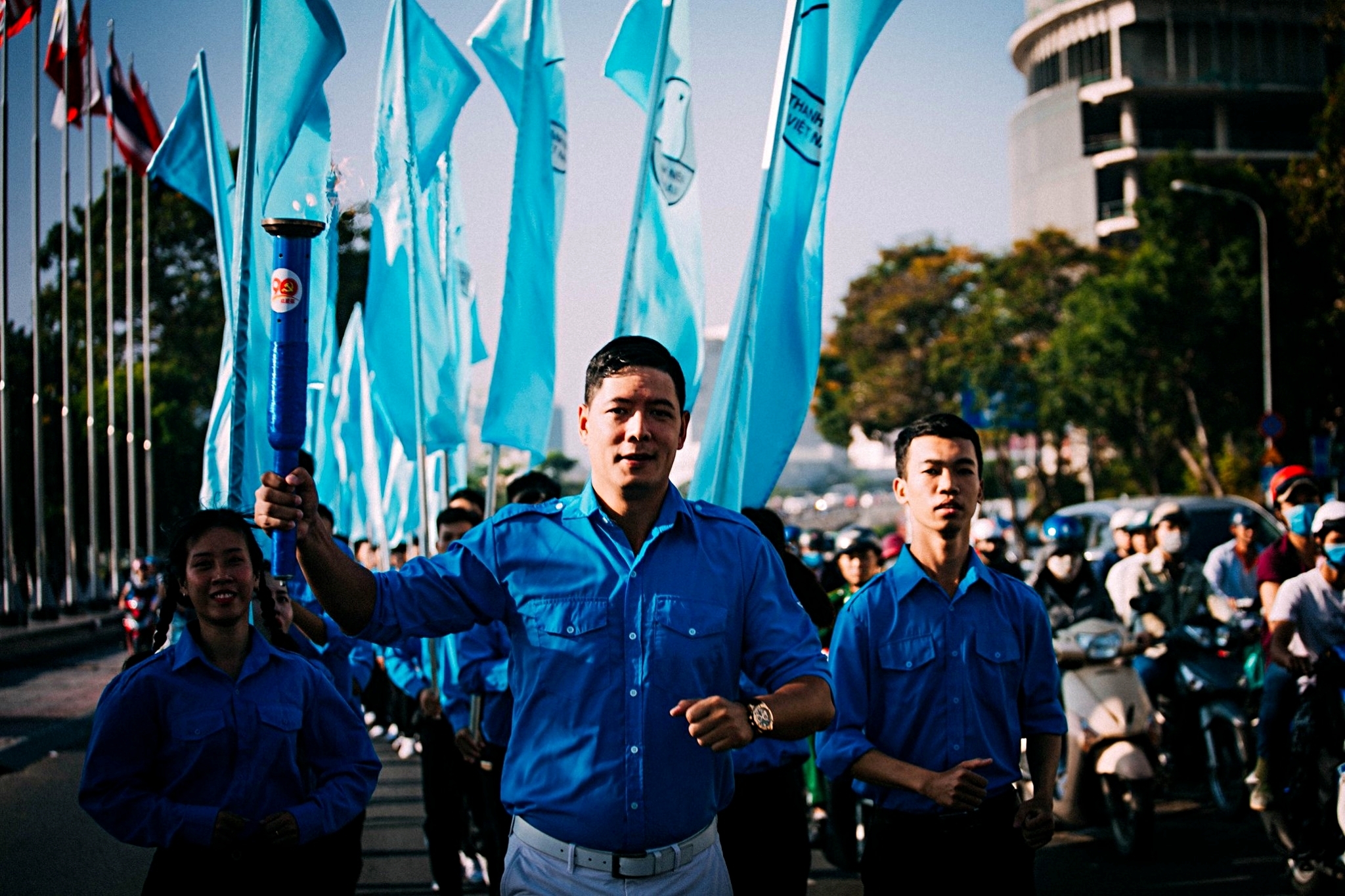 | Nam sinh viên được nhận định tích cực tham gia nhiều hoạt động do Thành đoàn TP.HCM, địa phương phát động. Trong ảnh, Thanh Sang tham gia sự kiện rước đuốc chào mừng ngày thành lập Đảng. |