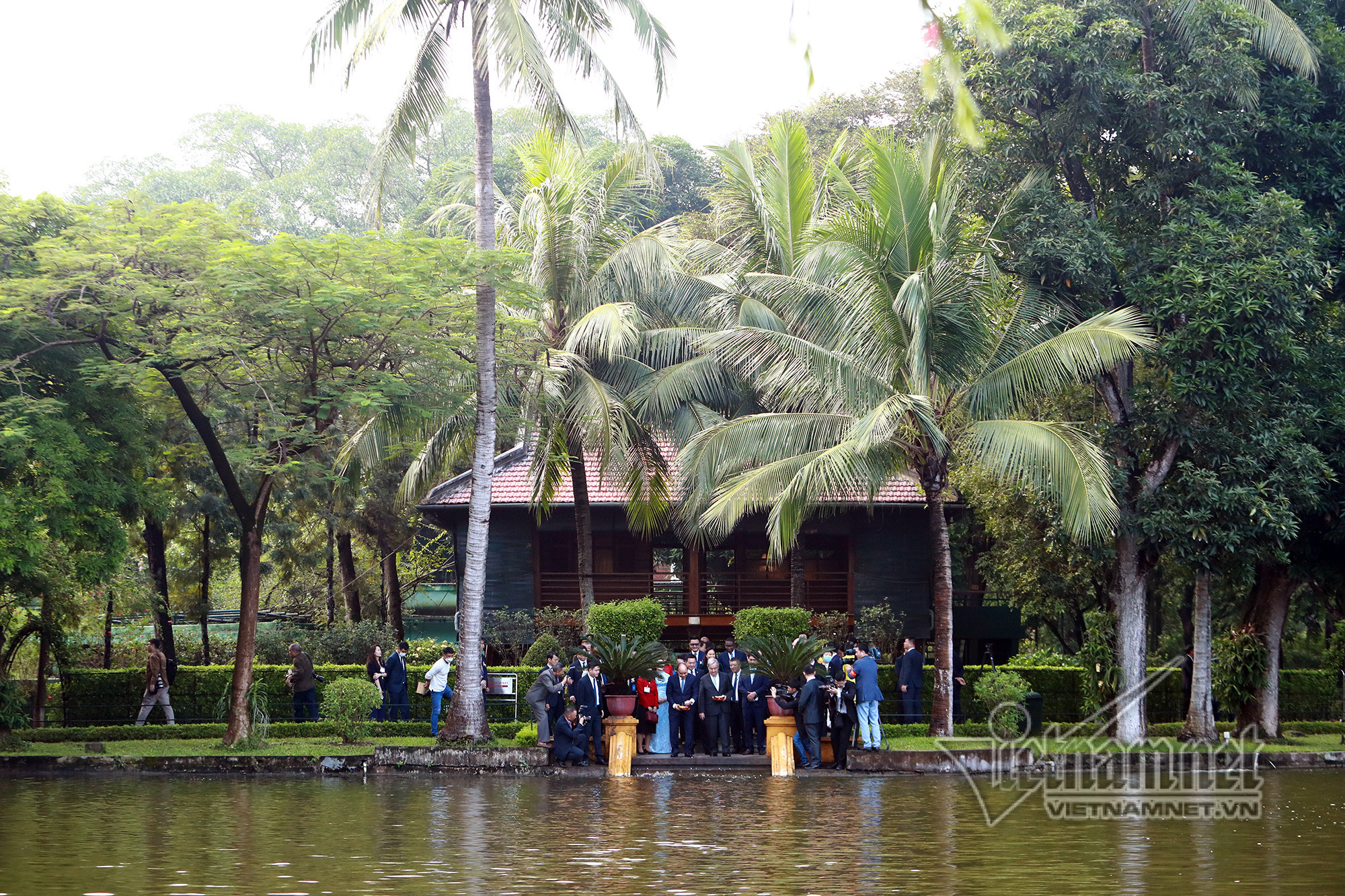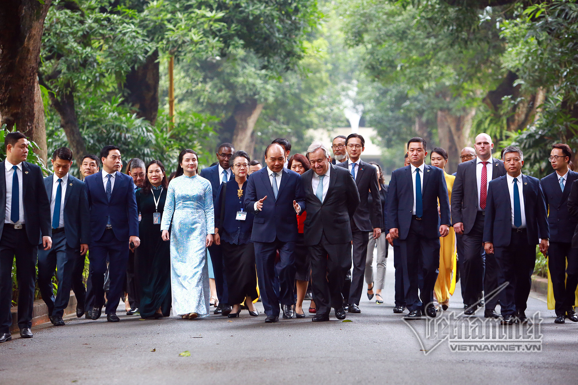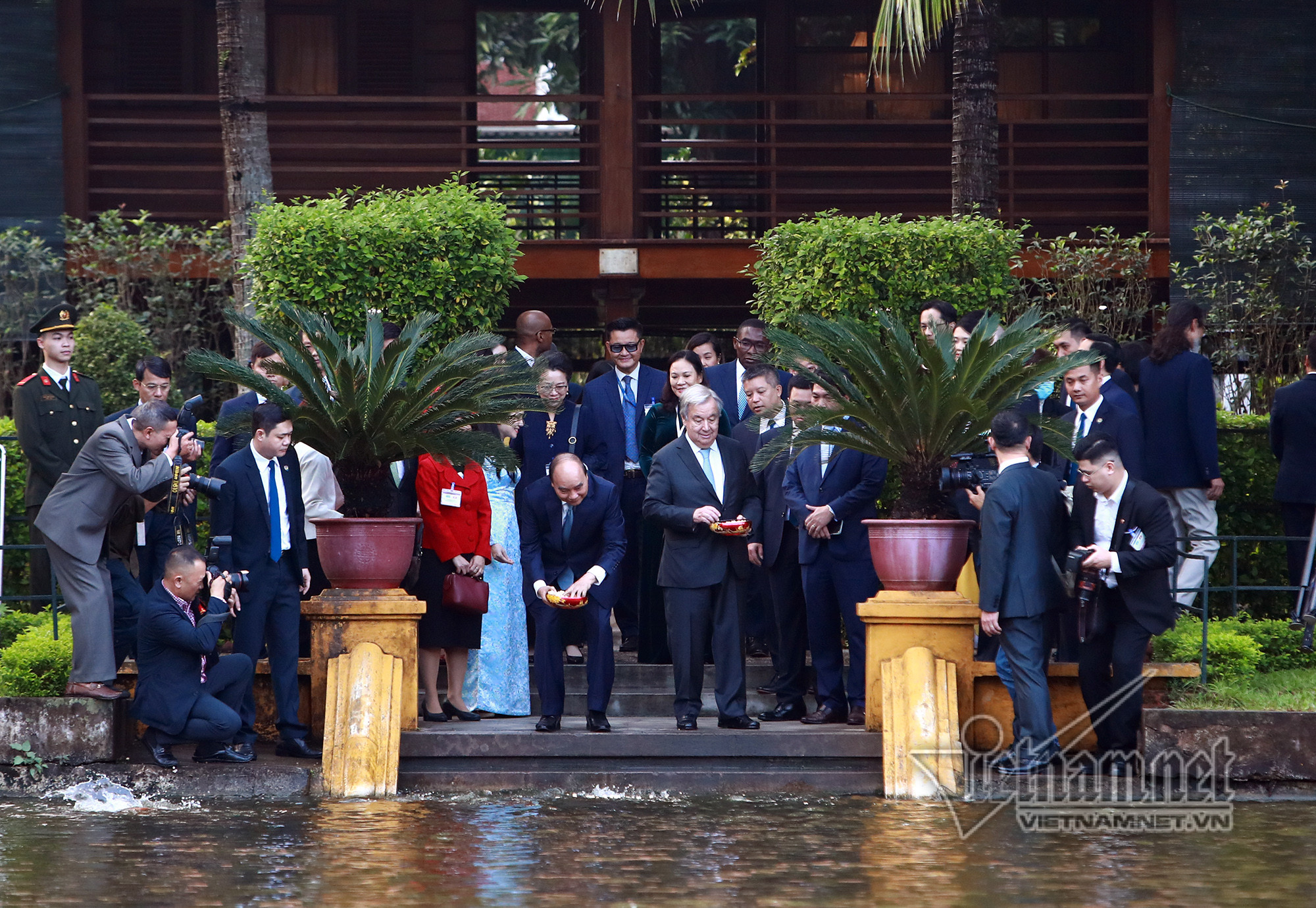 Sau cuộc hội đàm hiệu quả, trong tiết trời thu se lạnh, Tổng Thư ký LHQ António Guterres cùng Chủ tịch nước Nguyễn Xuân Phúc đã đi dạo, thăm nhà sàn Bác Hồ trong Khu di tích Chủ tịch Hồ Chí Minh.