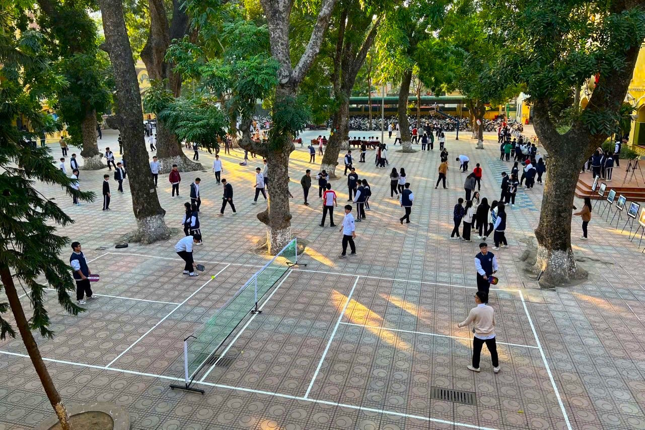 “Trong bối cảnh Sở GD-ĐT Hà Nội có công văn quy định không để học sinh sử dụng điện thoại trên lớp, thời gian đầu không ít học sinh dù tuân thủ nhưng có chút phàn nàn, chúng tôi nghĩ đến việc tổ chức các hoạt động giáo dục thể chất, trong đó có Pickleball. May mắn sân trường rất đẹp, có nhiều cây xanh, nên chúng tôi chỉ cần sửa sang lại, kẻ sân và lắp lưới di động là có thể thực hiện. Những giờ ra chơi gần đây, các em học sinh hầu như xuống sân trường hết và tỏ ra hào hứng với hoạt động này. Có lẽ đây là bộ môn thể dục thể thao nhẹ nhàng, ai cũng có thể chơi được nên học sinh rất thích. Các thầy cô cũng xuống sân chơi cùng tạo sự gắn kết rất tự nhiên, thoải mái”, bà Huyền chia sẻ.