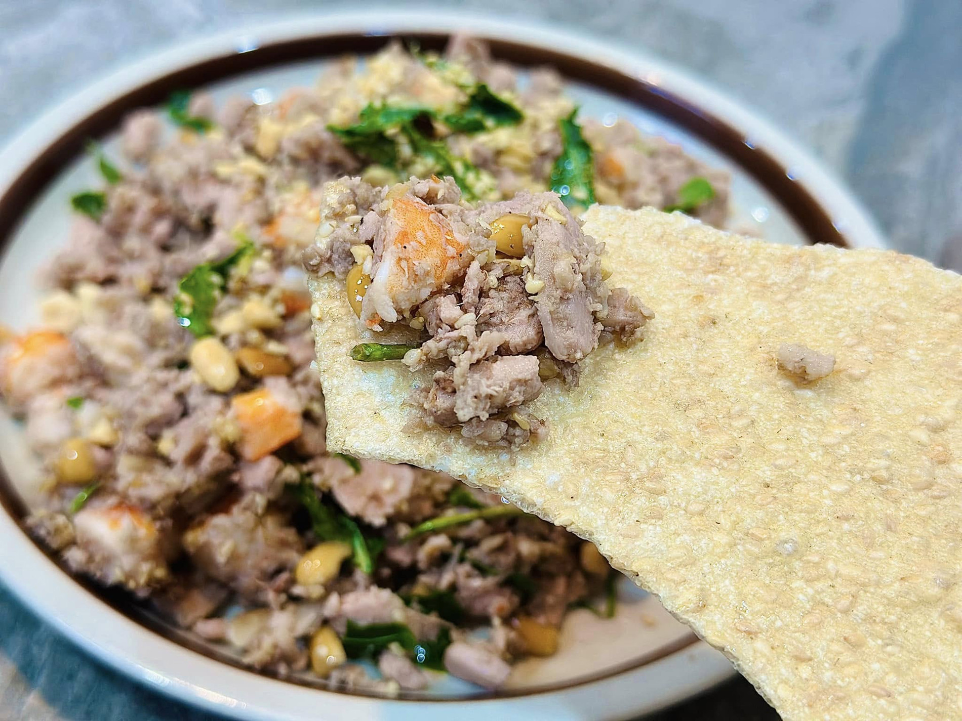Điều thú vị là món vả trộn của người Huế phải ăn kèm bánh tráng. Bánh tráng phải là loại bánh mè nướng vàng, giòn rụm. Cứ 1 miếng bánh tráng lại thêm 1 miếng vả trộn, đủ khiến thực khách cảm thấy kích thích mọi giác quan.