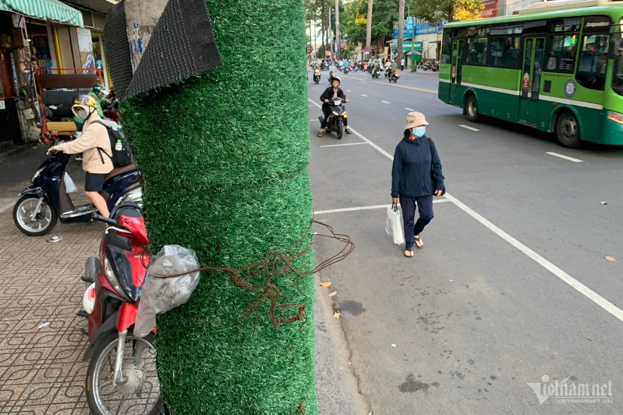Hàng nghìn trụ điện, cột đèn chiếu sáng theo dọc các tuyến đường thuộc quận 5 (TP.HCM) như Trần Nhân Tôn, Nguyễn Duy Dương, Trần Hưng Đạo, Nguyễn Trãi, Huỳnh Mẫn Đạt, Nguyễn Kim, Nguyễn Tri Phương... được quấn thảm cỏ nhựa màu xanh ở phía dưới gốc.