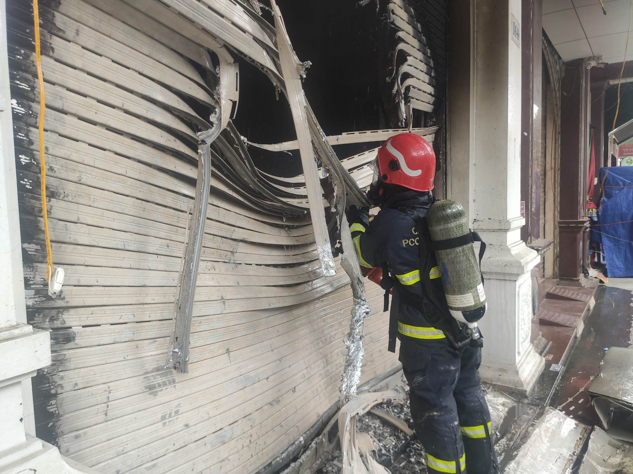 Do quán thiết kế kiểu nhà ống, chỉ có một cửa trước nên lửa bốc rất mạnh, làm biến dạng cửa cuốn tầng 1, khói bao trùm 3-4 cửa hàng bên cạnh, phải sơ tán người và hàng hoá.