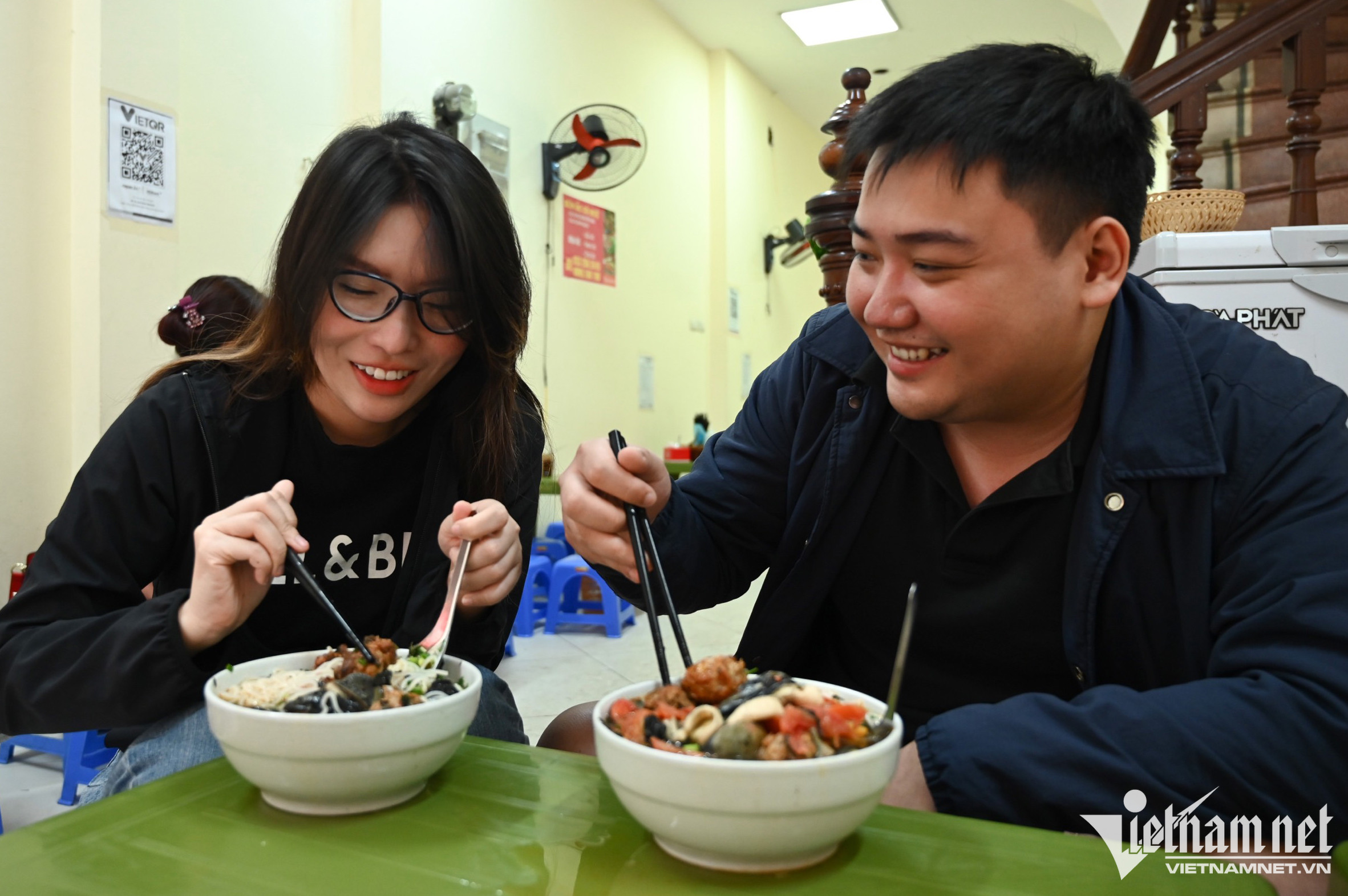 Trong chuyến công tác từ TP.HCM đến Hà Nội, anh Hùng và chị Linh tranh thủ đến đây thưởng thức ngay hai tô đặc biệt bởi ít khi họ có cơ hội được thưởng thức. "Tôi rất thích cách làm nước dùng ở đây. Chả ốc thì giòn thơm, giá lại rẻ", anh Hùng chia sẻ.