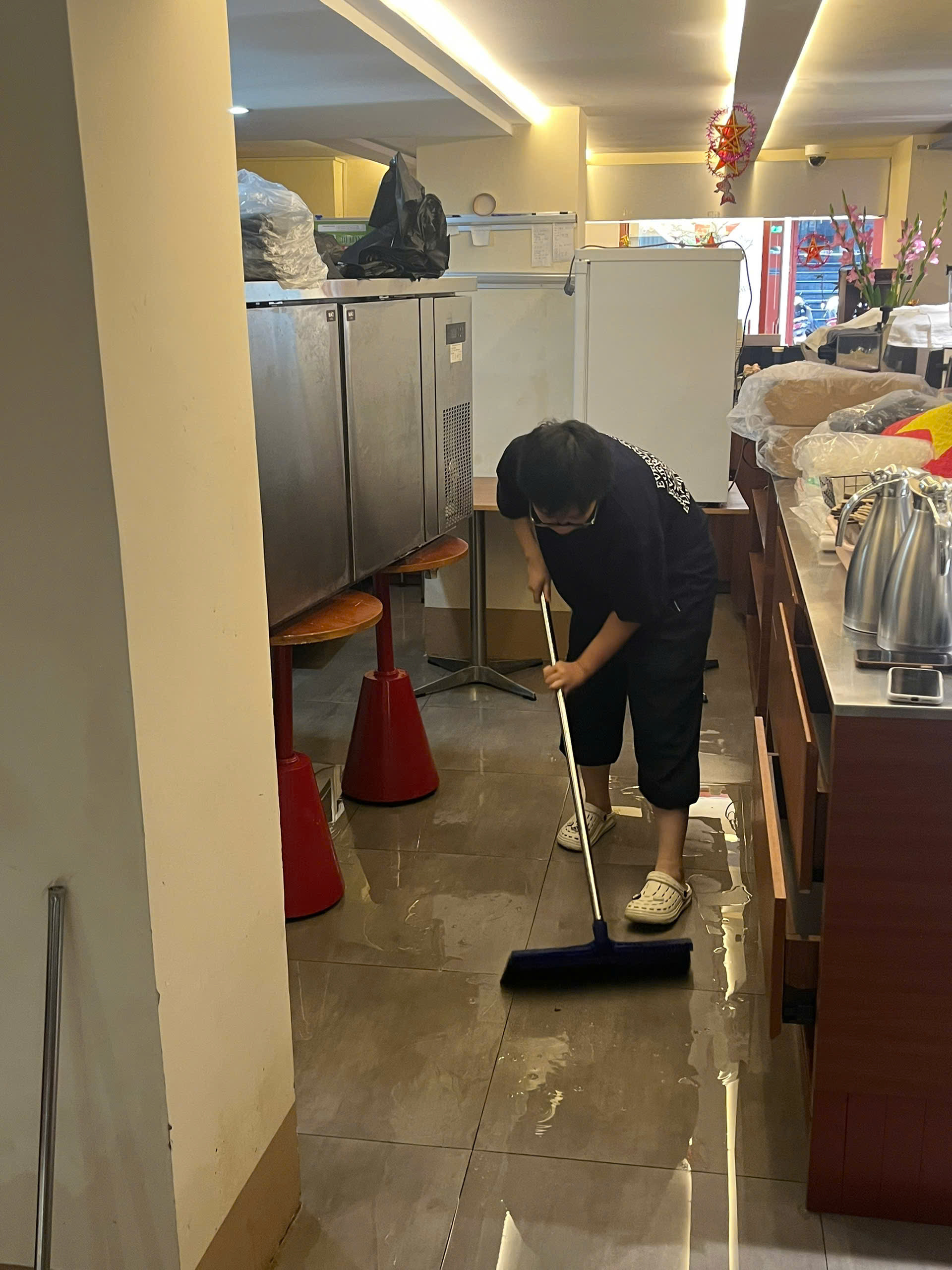 Sau lần đầu bị ngập bất ngờ không kịp trở tay, hai đợt tiếp theo, khi nghe tin dự báo bão về, quán cà phê này đều chủ động kê trang thiết bị lên cao, để hạn chế tối đa thiệt hại. Tuy nhiên, 3 đợt ngập sâu liên tiếp khiến nước thấm ngược từ sàn lên tường, rất khó xử lý. Trận ngập ngày 30/9 còn kéo dài 2 ngày liên tục.