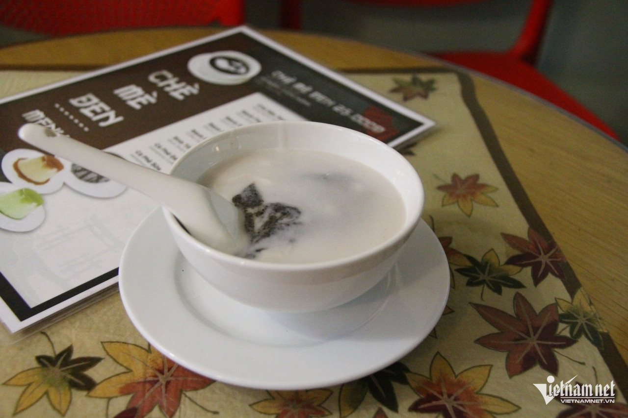 Để xua đi cái lạnh ướt mưa, nhóm bạn trẻ gọi món chè mè đen ấm nóng. Lần đầu thưởng thức món chè lạ, Tuấn Anh và nhóm bạn tấm tắc khen ngon.