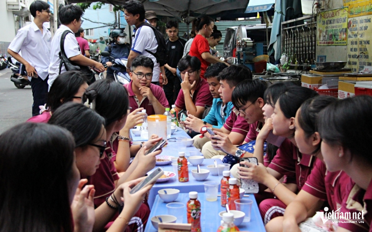 16h, bất chấp trời mưa lất phất, quán chè mâm nằm nép mình bên hông chung cư cũ trên đường Sư Vạn Hạnh (quận 10, TPHCM) vẫn chật cứng khách ngồi. Nhóm học sinh mặc đồng phục chiếm trọn dãy bàn nhỏ nằm ở một bên hẻm.