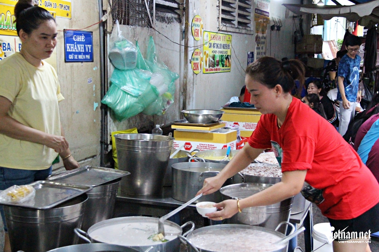 Nhân viên của quán tất bật múc, bưng những khay đầy ắp các bát chè phục vụ khách. Đây là quán chè nổi tiếng, thu hút những tín đồ hảo ngọt tại TPHCM suốt nhiều chục năm qua.