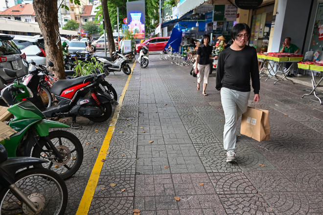 Nhiều tuyến đường trung tâm TP.HCM được kẻ vạch để phân định một bên cho sử dụng tạm và lối dành cho người đi bộ. Ảnh: Tuấn Kiệt.