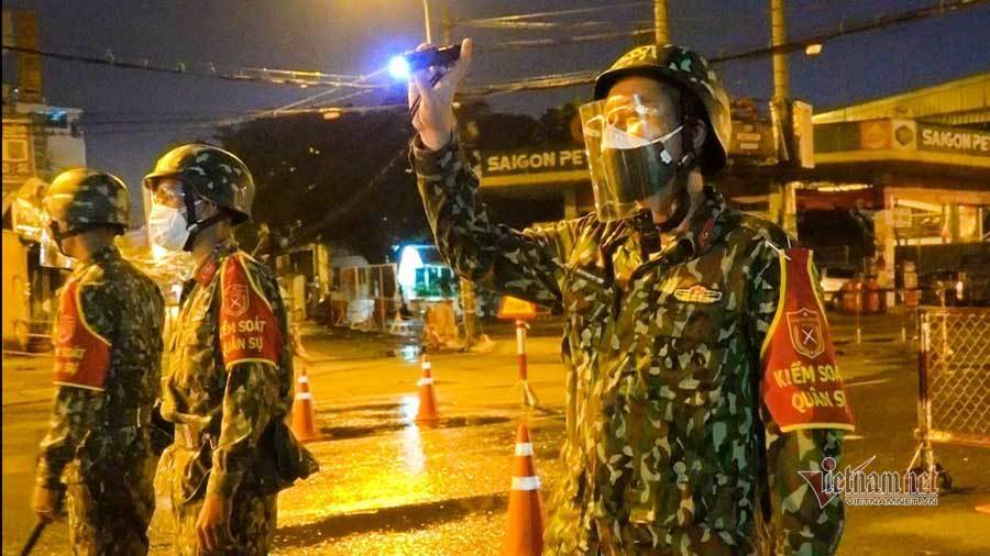 | Tại chốt kiểm soát trên đường Đinh Bộ Lĩnh, phường 26, Quận Bình Thạnh, bộ đội cùng các lực lượng phối hợp làm nhiệm vụ xuyên đêm |