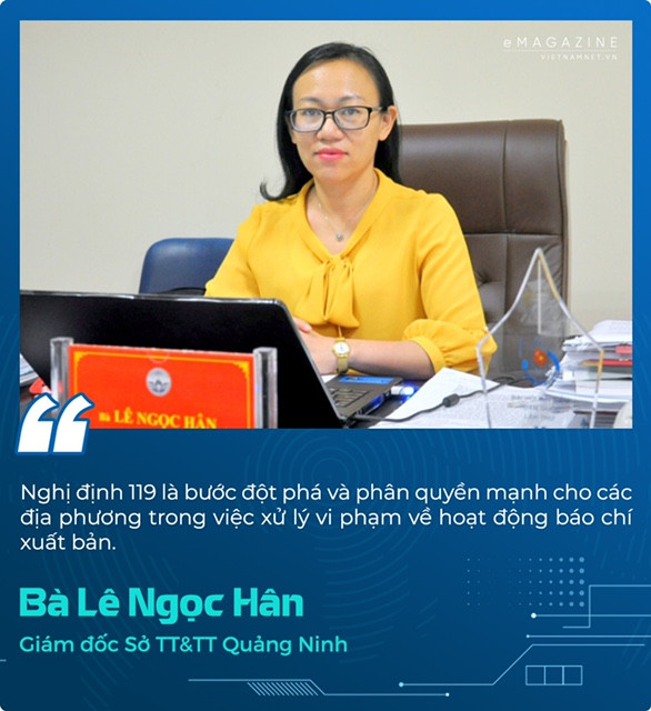 Về vấn đề này, bà Lê Ngọc Hân, Giám đốc Sở TT&TT Quảng Ninh cho hay, Nghị định 119 là bước đột phá và phân quyền mạnh cho các địa phương trong việc xử lý vi phạm về hoạt động báo chí xuất bản. Với quy định này. Những quy định về quản lý nhà nước siết chặt hoạt động của cơ quan báo chí như thực hiện tôn chỉ mục đích hay quy định xử phạt hành chính về hoạt động báo chí và xuất bản đã hỗ trợ cho địa phương rất nhiều.
