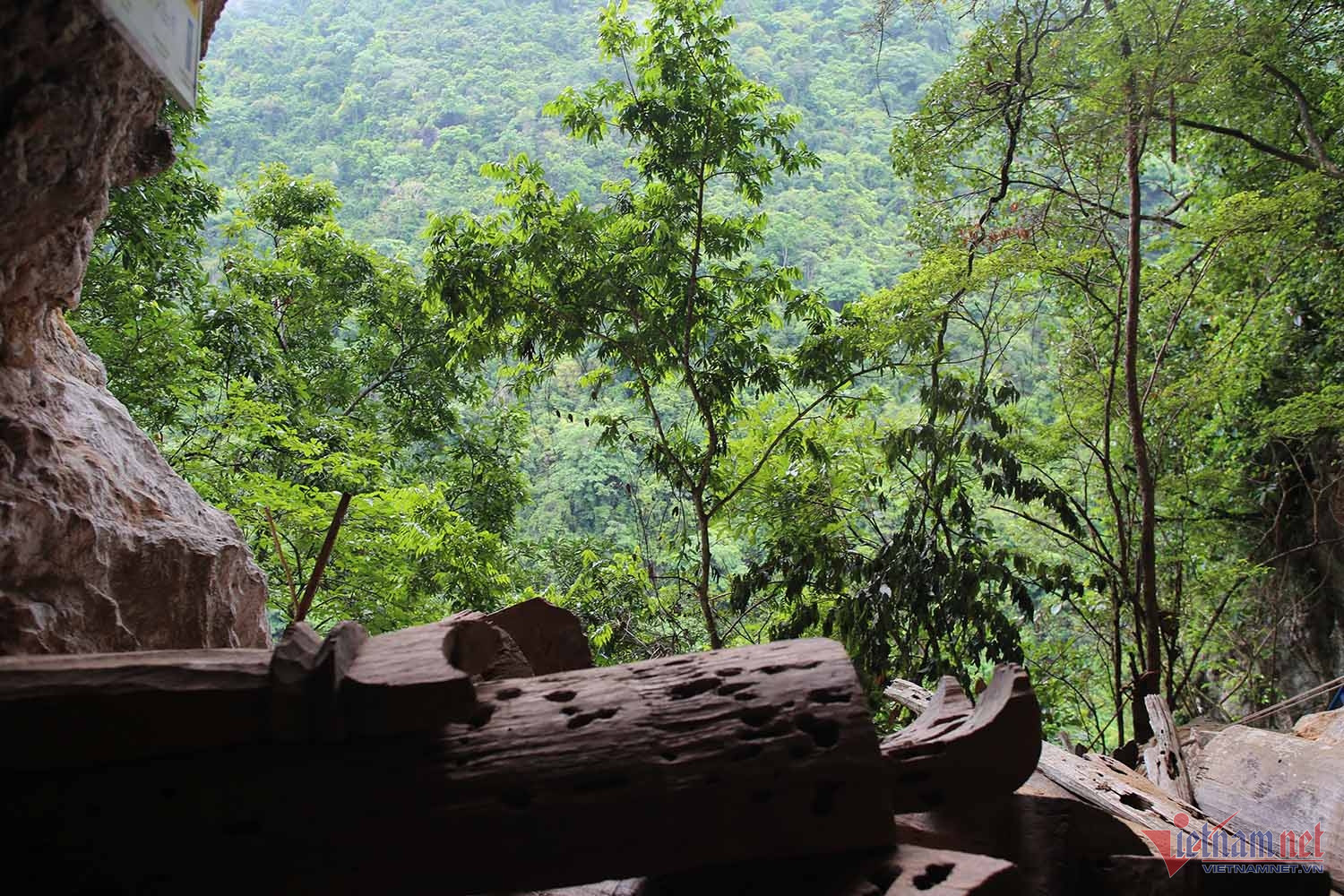 "Thua cuộc, người Xá mỗi khi có người chết lại hò nhau kéo quan tài lên hang núi để an táng, cứ người trên kéo người dưới đẩy lên. Có khi đẩy được 1 quan tài lên núi thì bị thương vong thêm mấy người. Chính vì vậy, người Xá lại chặt ngón tay và thề không xâm phạm vào đất người Thái nữa rồi bỏ đi", ông Chiền giải thích về nguồn gốc của những cỗ quan tài nằm cheo leo trên đỉnh núi.