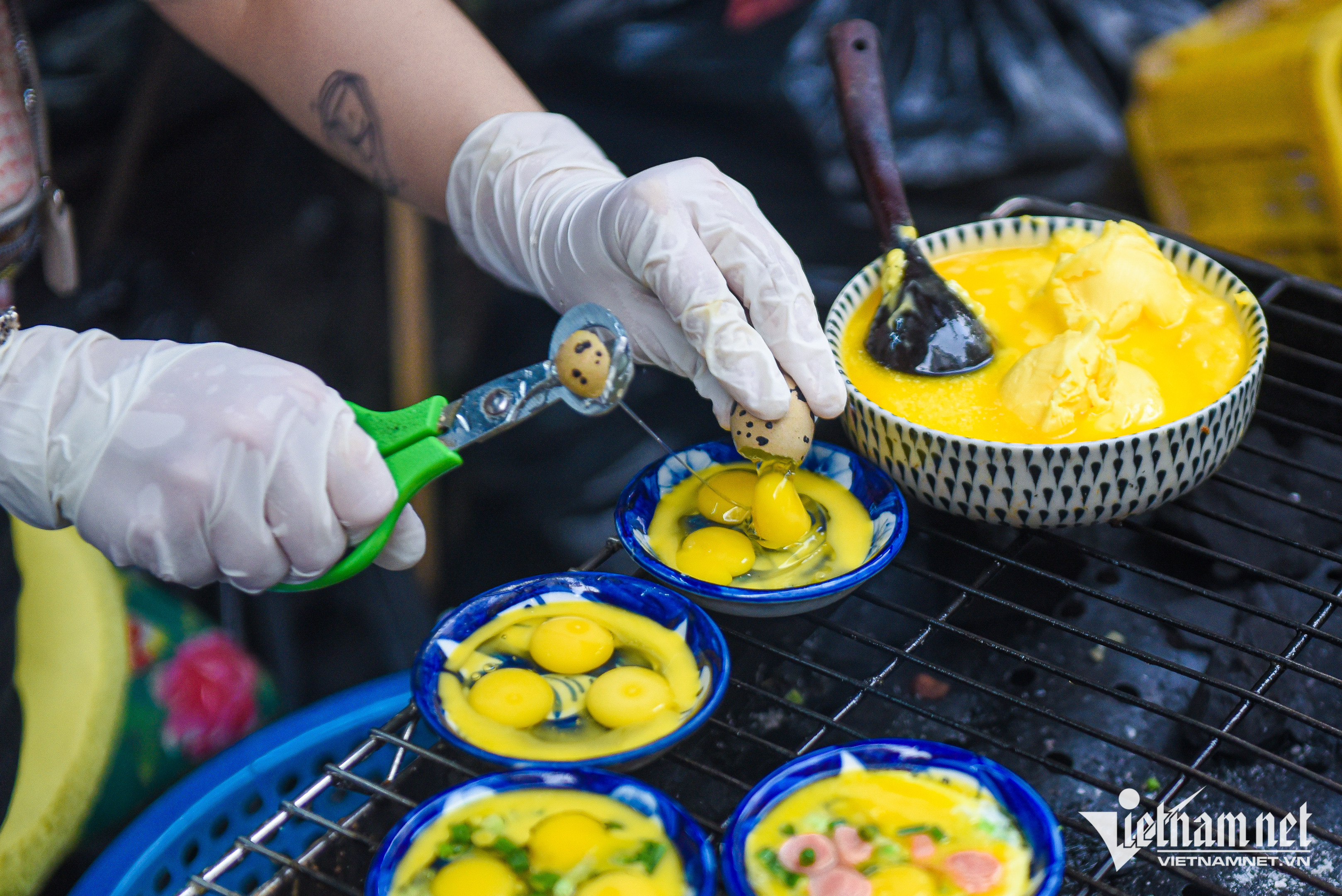 Đầu tiên chủ quán sẽ phết bơ, rồi đập trứng cút vào chén, thêm hành tươi, xúc xích. Khi trứng gần chín tới thì cho thêm ruốc, hành khô lên trên để chúng không bị ngấm quá nhiều bơ