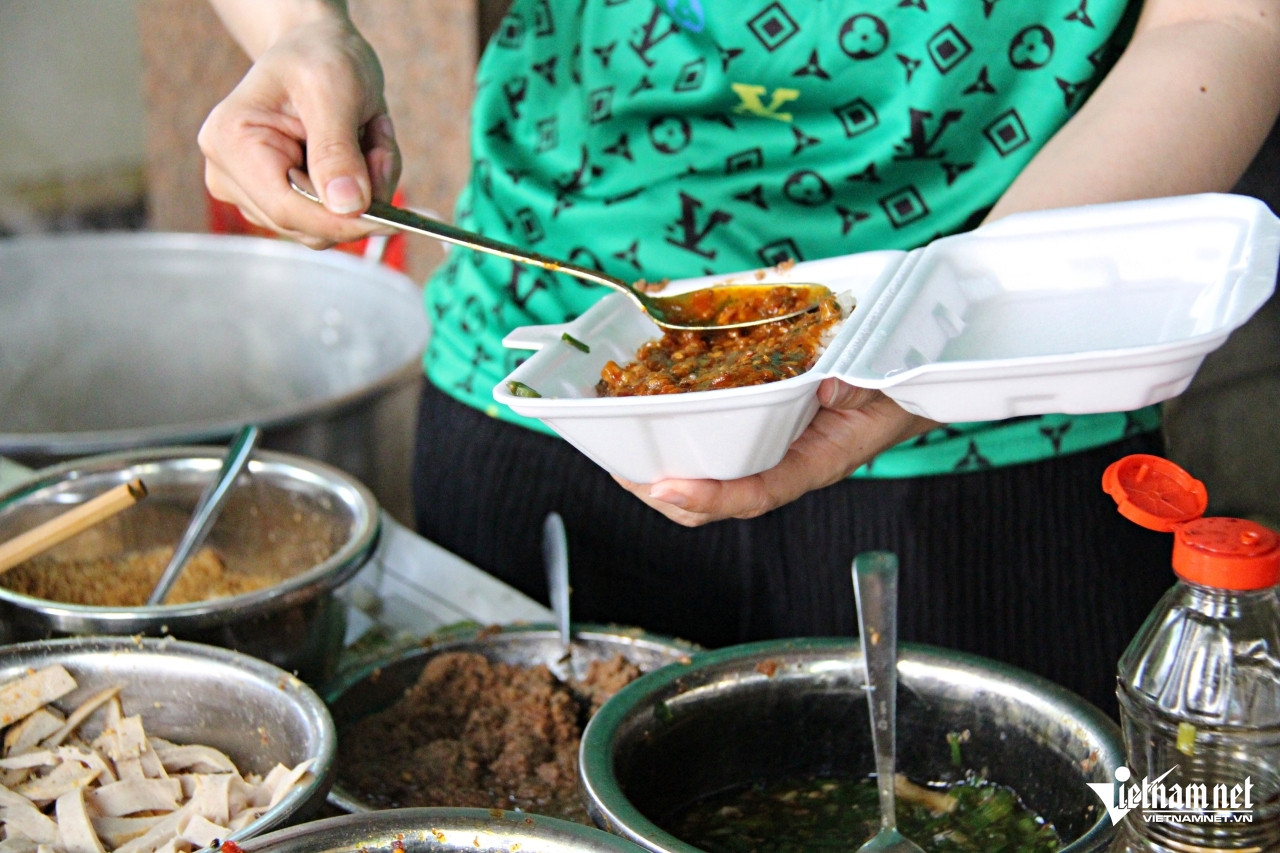 Khi có khách, các nhân viên thoăn thoát múc xôi vào lá chuối xanh đã chuẩn bị, cho thêm chả lụa, pa-tê, ruốc, lạc và nước sốt sa tế với một chút mỡ hành.