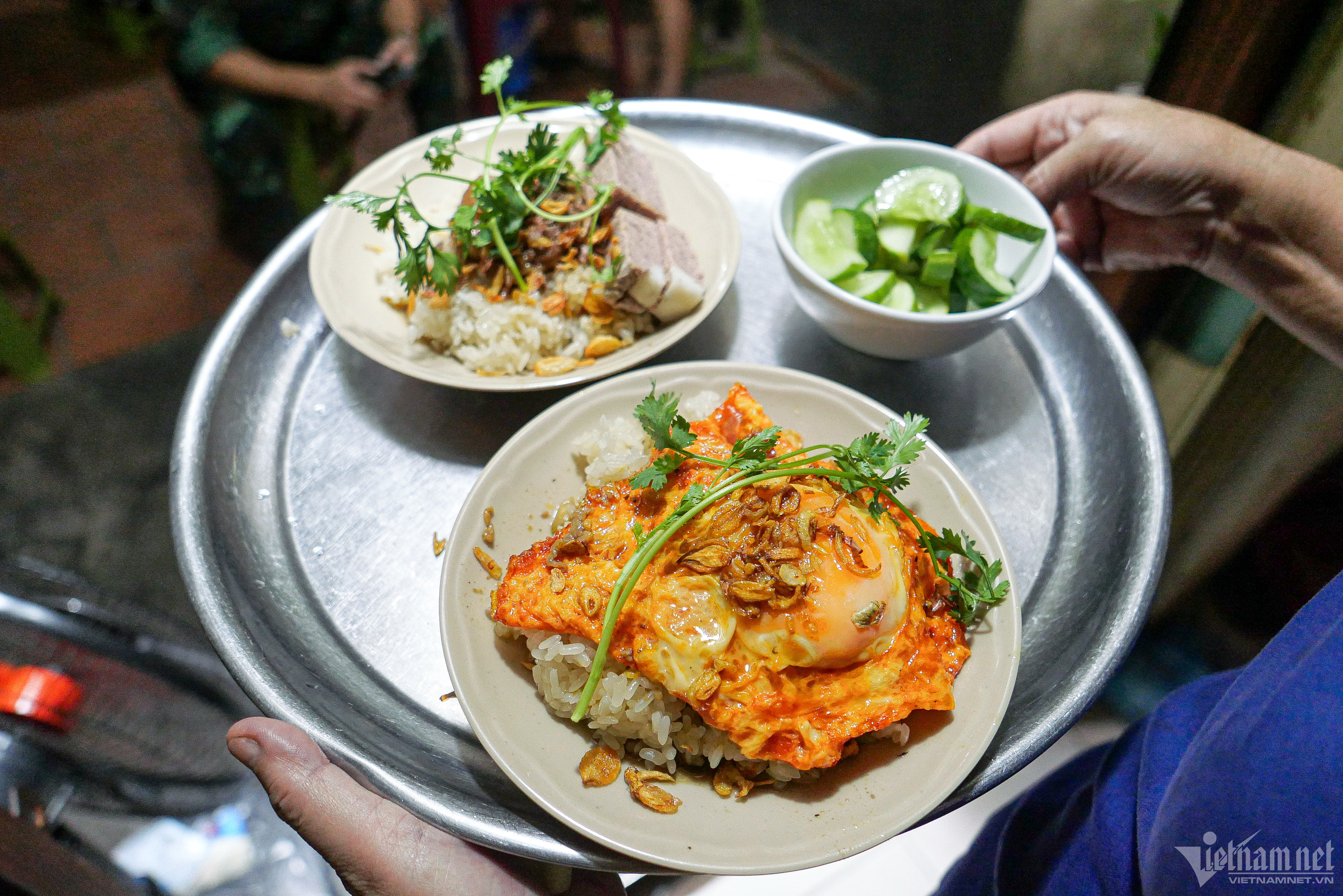 Theo chủ quán, ông không ướp thịt bằng nước mắm vì át hương vị của các nguyên liệu khác. Giá mỗi bát xôi thịt má đào là 35.000 đồng.