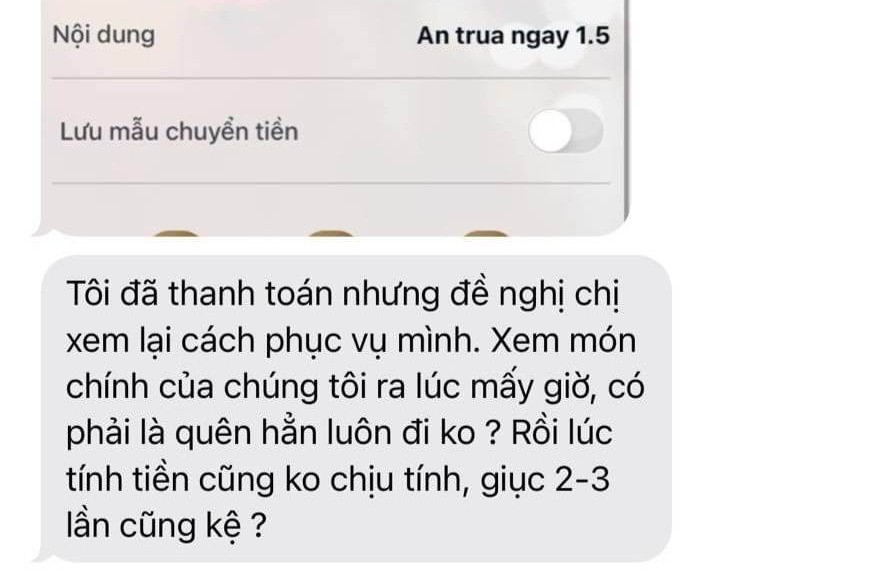 Tuy nhiên, trong nội dung tin nhắn trả tiền cho nhà hàng Minh Lưu, người có số điện thoại 0961619…cho rằng quán đã phục vụ chậm đồ ăn và sau đó đoàn khách mình đã gọi chủ quán tính tiền đến mấy lần mà không ai ra tính nên mới rời đi.