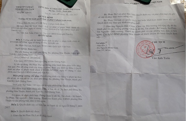 Mới đây, gia đình bà Lan nhận được quyết định cưỡng chế của UBND TP Tam Kỳ.