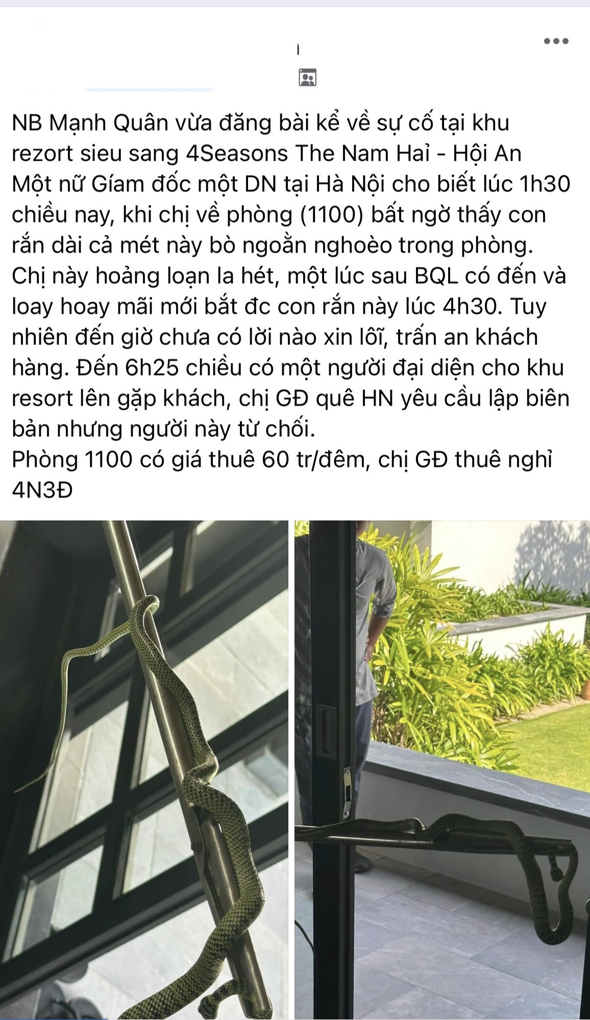 Khoảng 13h chiều 1/5, khi nữ du khách về phòng thì bất ngờ thấy con rắn dài hơn 1m bò ngoằn ngoèo trong phòng. “Chị này hoảng loạn la hét, một lúc sau, Ban quản lý đến và loay hoay mãi mới bắt được con rắn lúc 16h30. Tuy nhiên lúc này chưa có lời nào xin lỗi, trấn an khách hàng. Đến 16h25, một người đại diện khu resort lên gặp khách, chị giám đốc quê Hà Nội yêu cầu lập biên bản nhưng người này từ chối”, dòng trạng thái viết. |